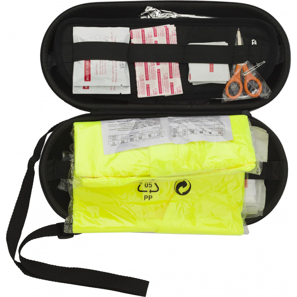 Autós elsősegélykészlet EVA tokban. Tartalma: 15 db ragtapasz, 10 db alkoholos lap, 1 db film kötszer, 2 db biztosítótű, olló, tisztítólapok, biztonsági mellény, takaró, dinamós lámpa.