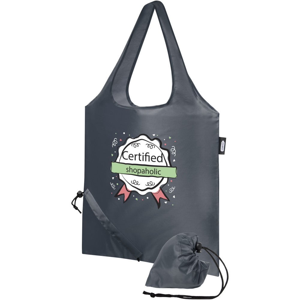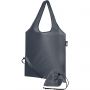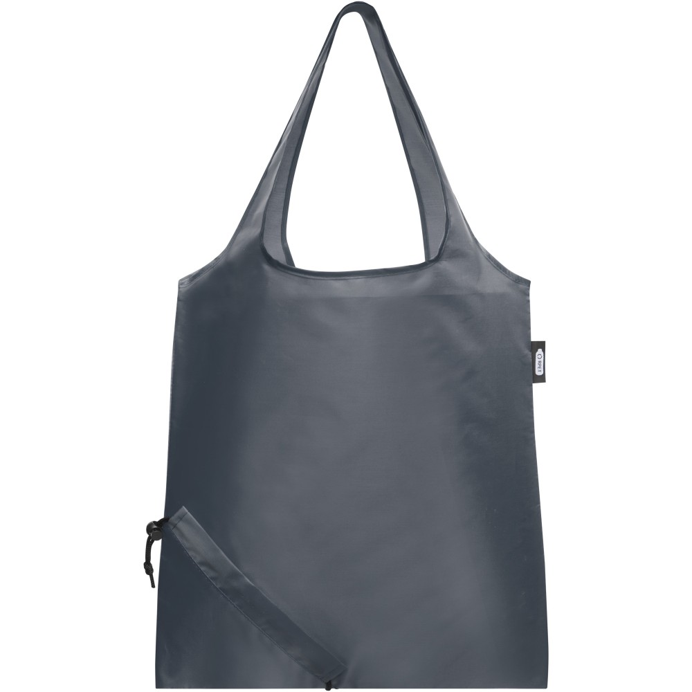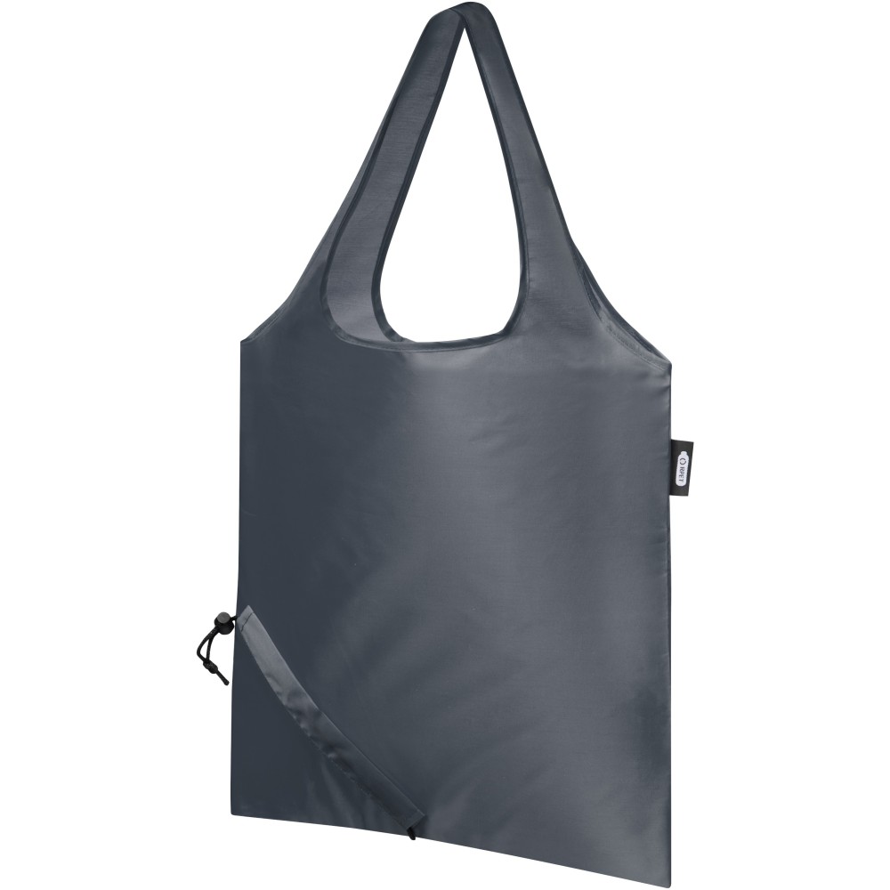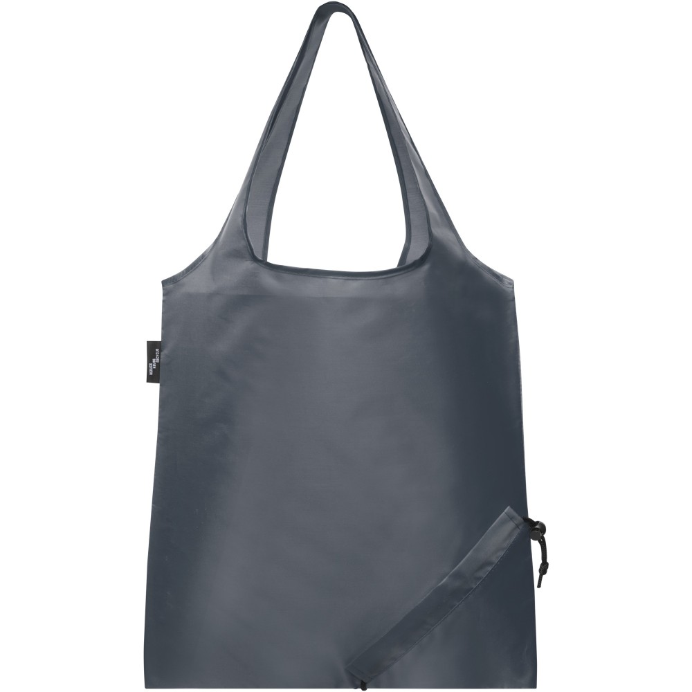 Bevásárlótáska egy nyitott fő rekesszel. Összehajtva zsinórral rögzíthető. A fülek magassága 26 cm. RPET.