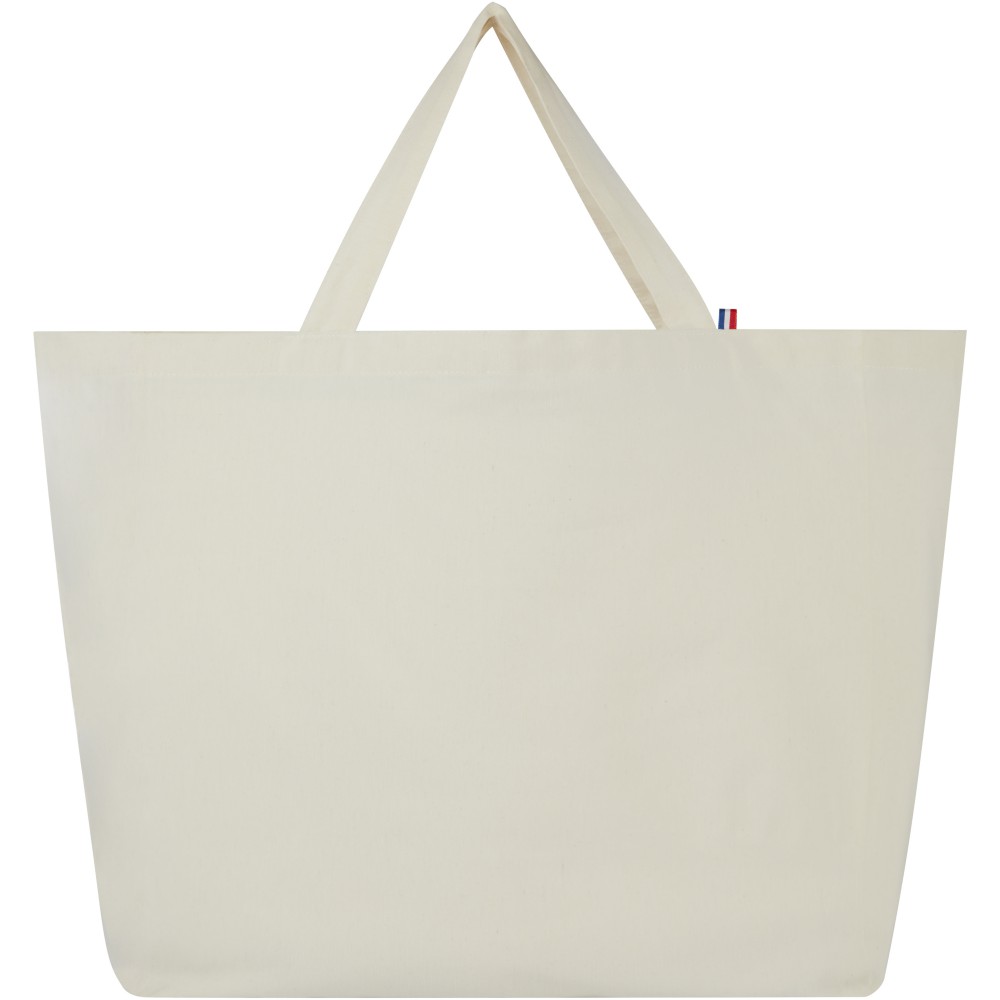 Ez a nagy táska a legfinomabb kidolgozású, 100%-ban újrahasznosított anyagokból készült. A mindennapi életben való használatban alkalmas nehéz könyvek vagy bevásárlások szállítására. A 200 g/m2-es újrahasznosított pamut/poliészter keverék biztosítja a tartósságot és a megbízhatóságot, így a táska akár 14 kg súlyt is elbír. Az alapanyag Ázsiából származik, de a szövés és a gyártás Franciaországban történik.