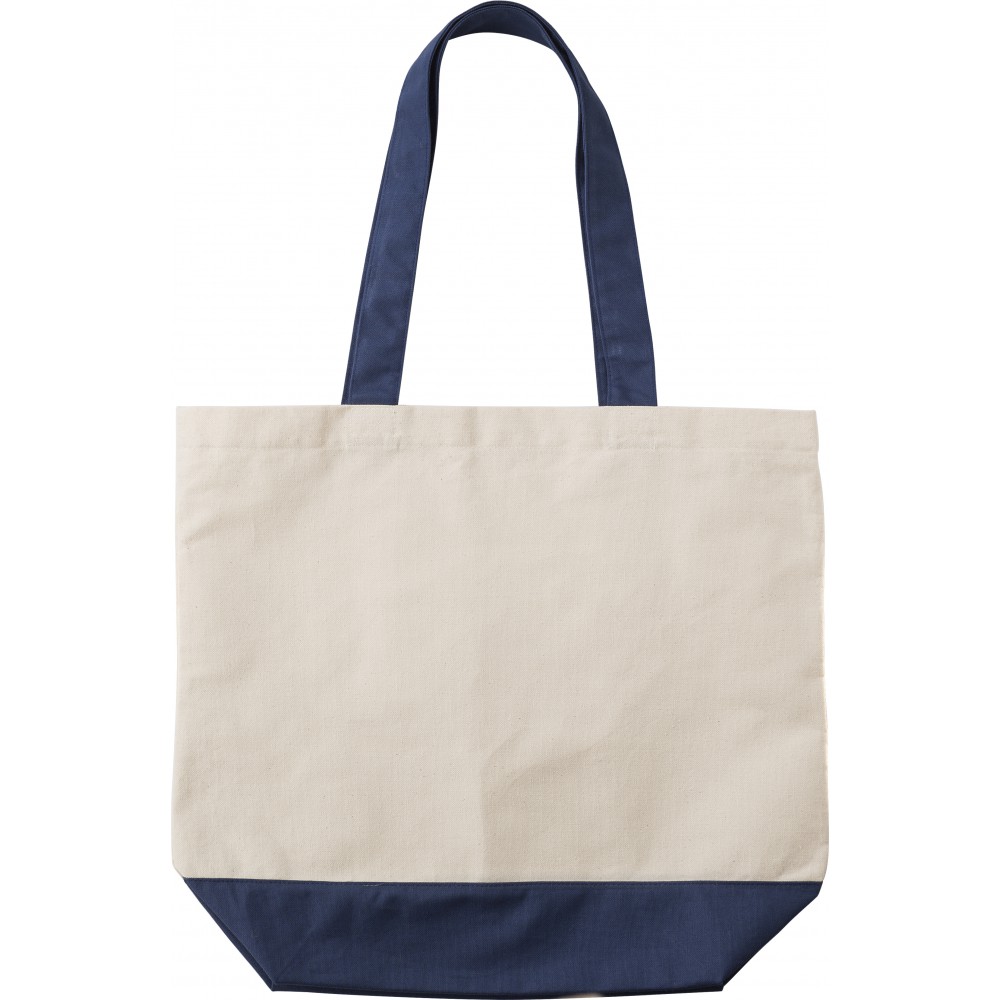 Bevásárlótáska vagy strandtáska belső zsebbel, színes füllel és alsó résszel. 280 g/m2 vászon anyag.