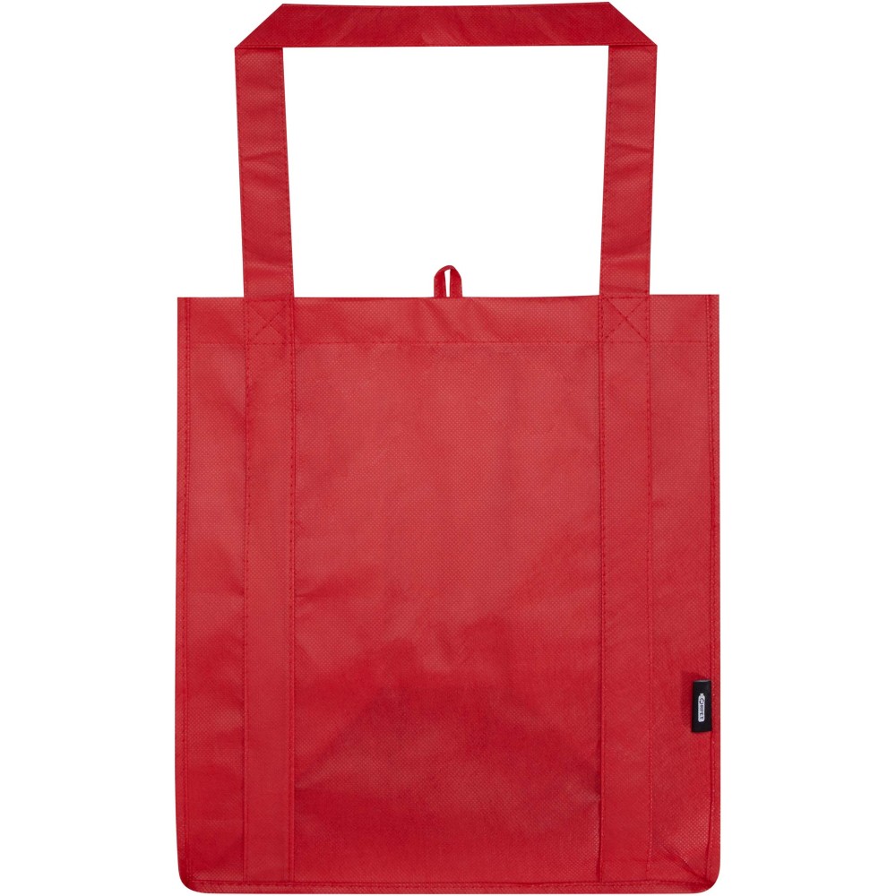 A Liberty GRS tanúsítvánnyal rendelkező újrahasznosított bevásárlótáska tartós és szakadásálló nem szőtt RPET anyagból készült, megerősített aljrésszel, amely extra stabilitást és sokoldalú felhasználást biztosít. A táska nagy méretű főrekesszel és 25 cm hosszú fülekkel rendelkezik, így kényelmesen hordozható. Űrtartalma: 29 liter. Teherbírás: akár 12 kg.