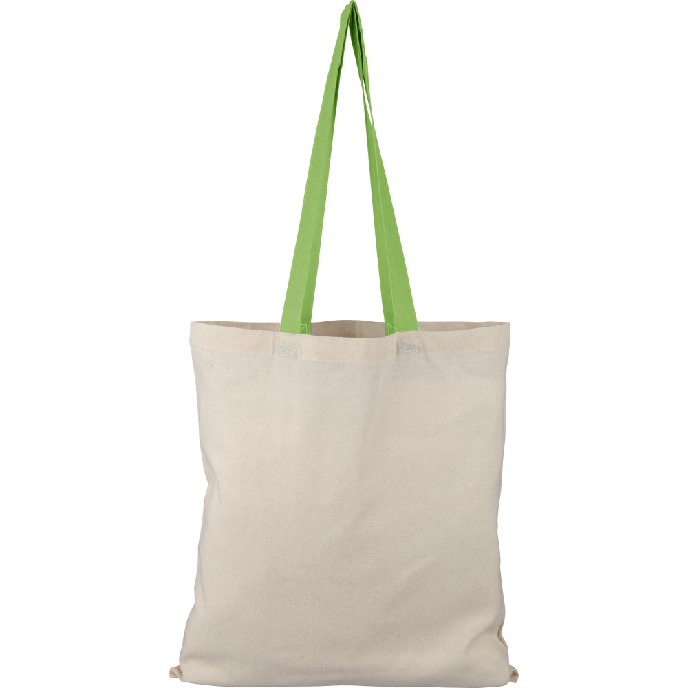 Oeko-Tex minősítésű, 140 g/m2 pamutból készült bevásárlótáska natúr színben, színes fülekkel. Mérete 38 × 42 cm, a fülek hossza 70 cm, szélessége 2,5 cm. Oeko-Tex címkével ellátva.