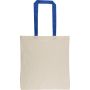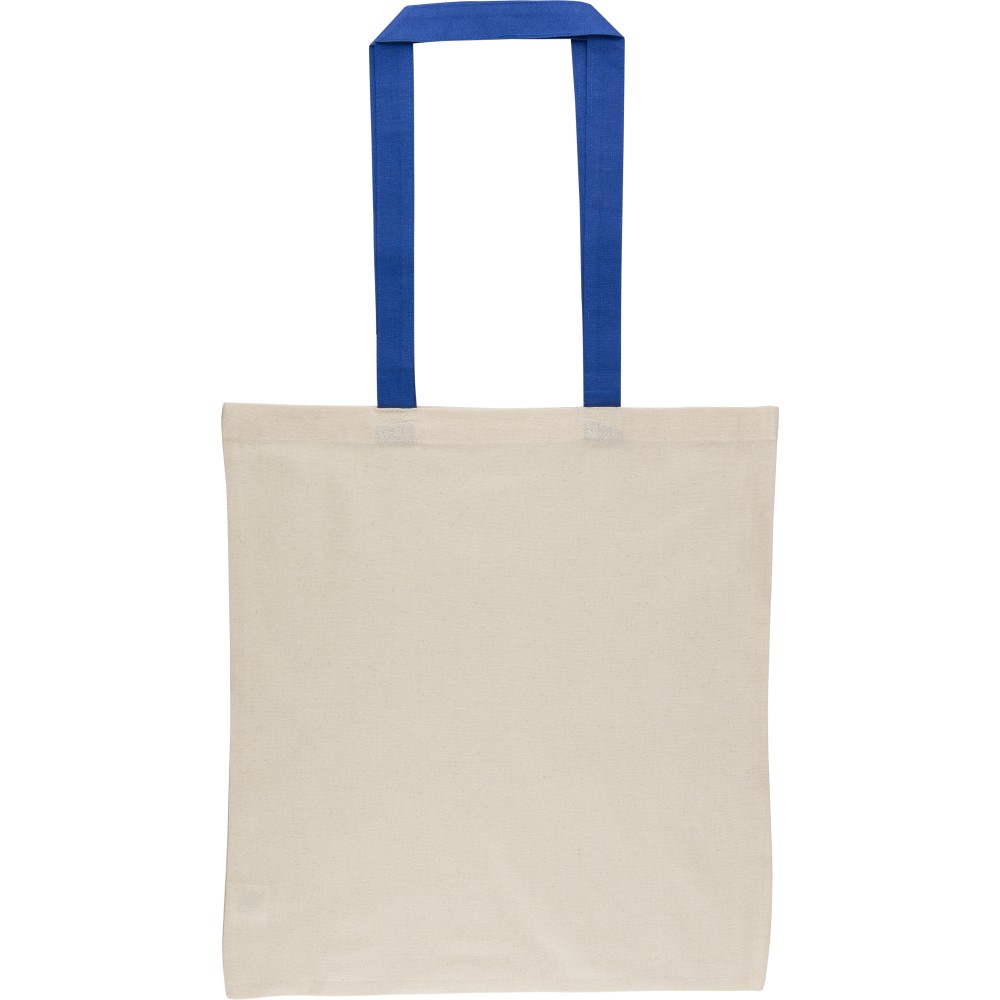 Oeko-Tex minősítésű, 140 g/m2 pamutból készült bevásárlótáska natúr színben, színes fülekkel. Mérete 38 × 42 cm, a fülek hossza 70 cm, szélessége 2,5 cm. Oeko-Tex címkével ellátva.