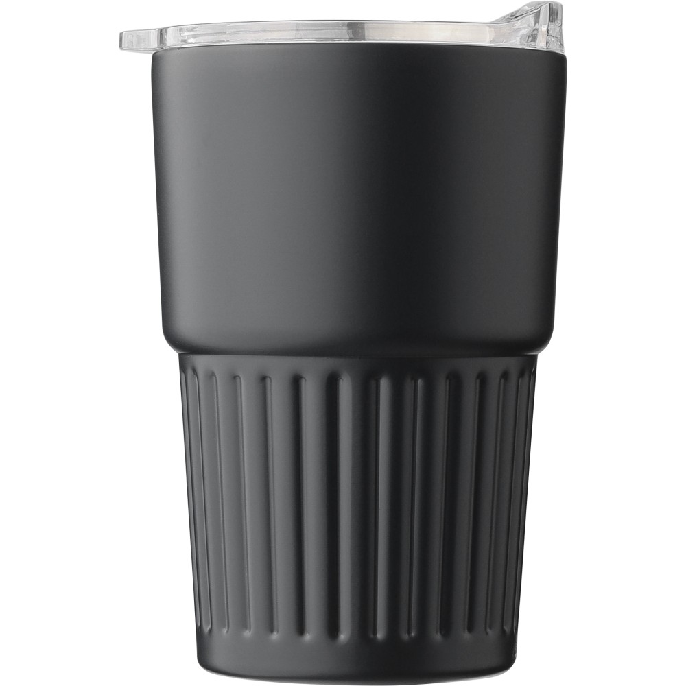 Újrahasznosított rozsdamentes acél útibögre, 450 ml. A belső 304-es, a külső 201-es rozsdamentes acélból készült, bordás markolattal és masszív fogantyúval, műanyag, csúszózáras fedéllel. Gravírozott újrahasznosított logó található a bögrén. Csomagolása barna papírdoboz.