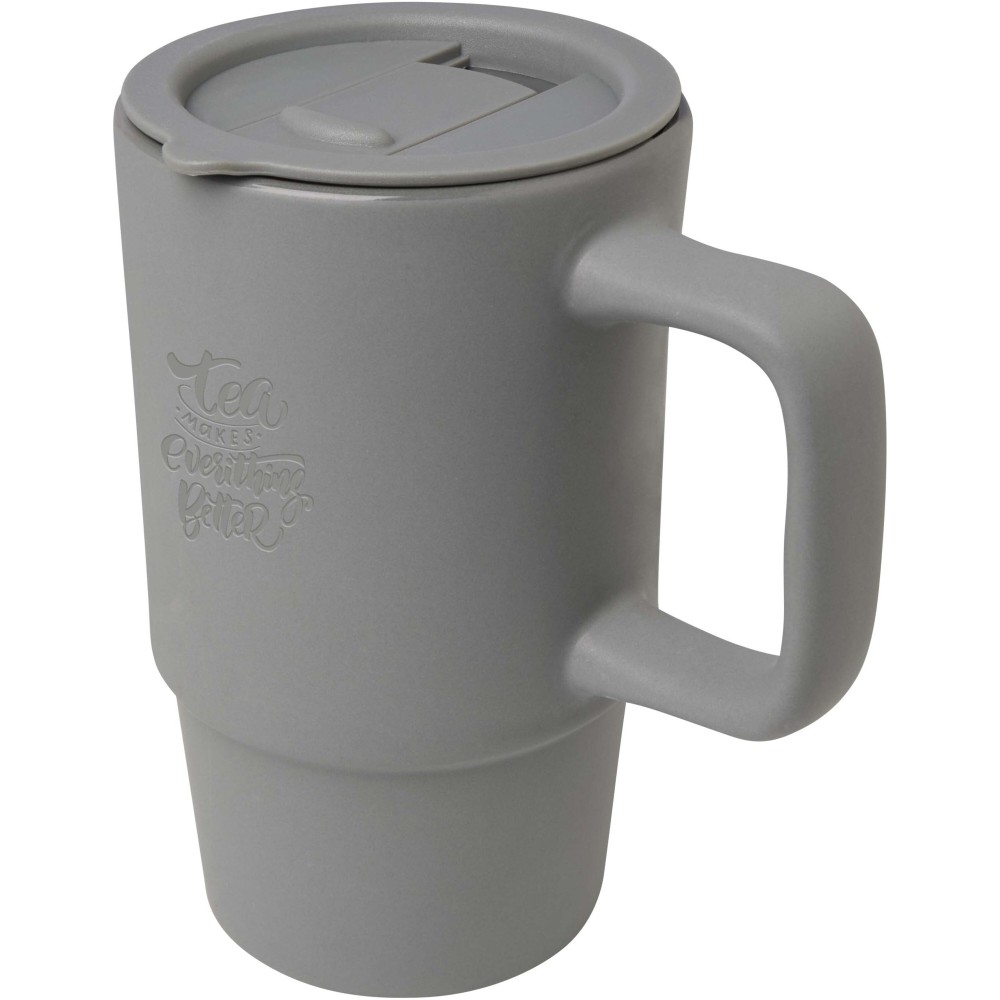 Kerámia bögre nagy, túlméretezett füllel a könnyű fogás érdekében, valamint cseppmentes műanyag tetővel az útközbeni kényelemhez. Külső felülete stílusos, matt kivitelű, a bögre pedig minden nyomtatási eljárás esetén mosogatógépben mosható. Újrahasznosított kartondobozos díszcsomagolásban kerül átadásra. Űrtartalom: 450 ml.