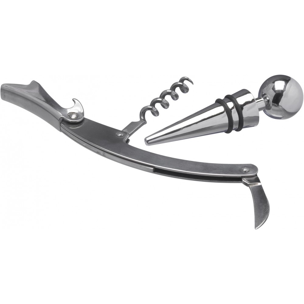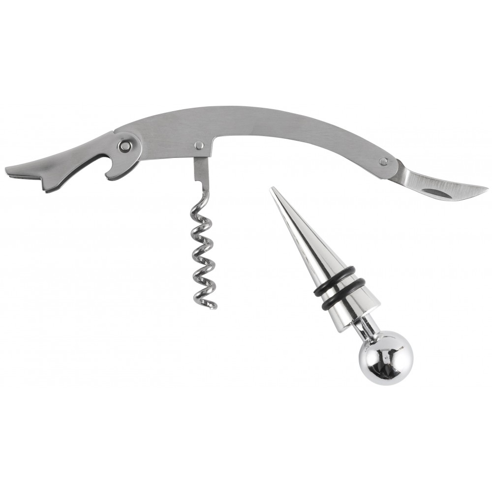 Üvegdugó és pincérbicska díszdobozban. Rozsdamentes acél.