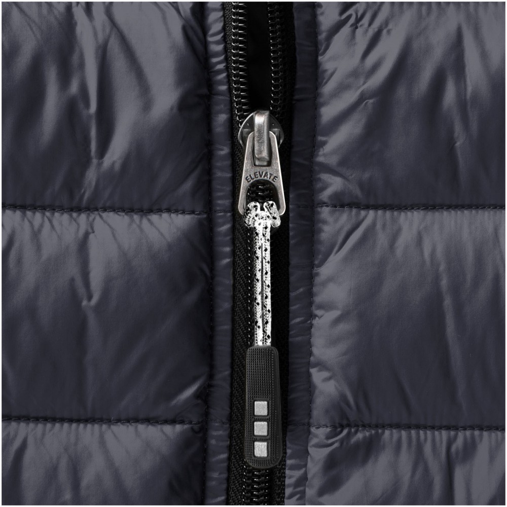 Normál szabásvonal. Pehelybiztos anyag. Cipzáros mell- és oldalzsebek. Emblémázásra alkalmas, cipzáros karzseb. Gumis szegély az aljon és a karöltőben. Könnyen megfogható cipzárhúzókák . Szél elleni állvédő betét a nyaknál. Vízlepergető, lélegző és szélálló. Hátul fényvisszaverő logónyomat . Könnyű, szigetelt pehelydzseki. 100% nylon, szőtt anyag, dupla vízlepergető bevonat, 20D. 80% pehely és 20% toll töltet. 115 g/m2