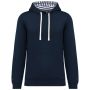 80% fésült pamut/20% poliészter. 3 fonalú pamut. Karcsú szabás. Egyenes ujjak. Kenguru zsebek. Félhold alakú betét a nyakkivágásnál, hogy megkönnyítse a díszítéshez való hozzáférést a nyakkivágás belsejében. 1x1 bordázott mandzsetta és szegély. Tematikusan nyomtatott pamut trikószövetből készült, kontrasztos húzózsinórral bélelt kapucni. Letéphető márkacímke.