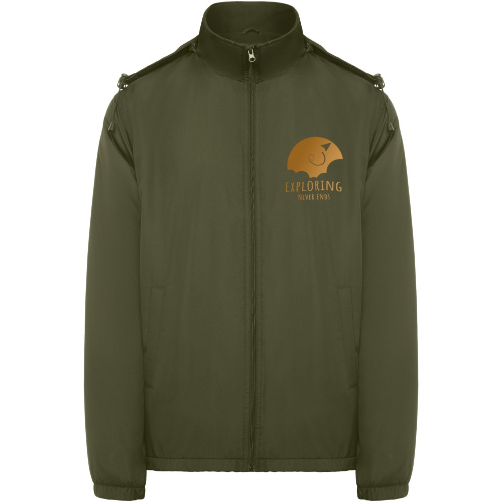 Könnyű vízálló dzseki. Magas gallér és behajtható kapucni állítóval. Mikropolár bélés. Elülső cipzár és állvédő. Gumis kézelők. Két cipzáras oldalzseb. Belső bal oldali mellzseb. Vízálló. Szélálló. 100% poliészter, 85 g/m2. Bélés: 100% poliészter, 180 g/m2, bélés, mikropolár, 180 g/m2. Töltet: 100% poliészter, 65 g/m2.
