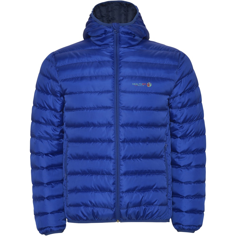Pehely tapintású férfi steppelt dzseki kapucnival, tasakkal. Fordított cipzárakkal, hozzá illő állvédővel. Két cipzáras elülső zseb. Gumis kézelő, a alj- és a kapucniszegély. Kontrasztos belső bélés. Könnyű és összehajtható ruhadarab. Vízálló. Szélálló modell. 100% poliészter, 290 g/m2. Bélés: 100% poliészter. Töltet: 100% poliészter.