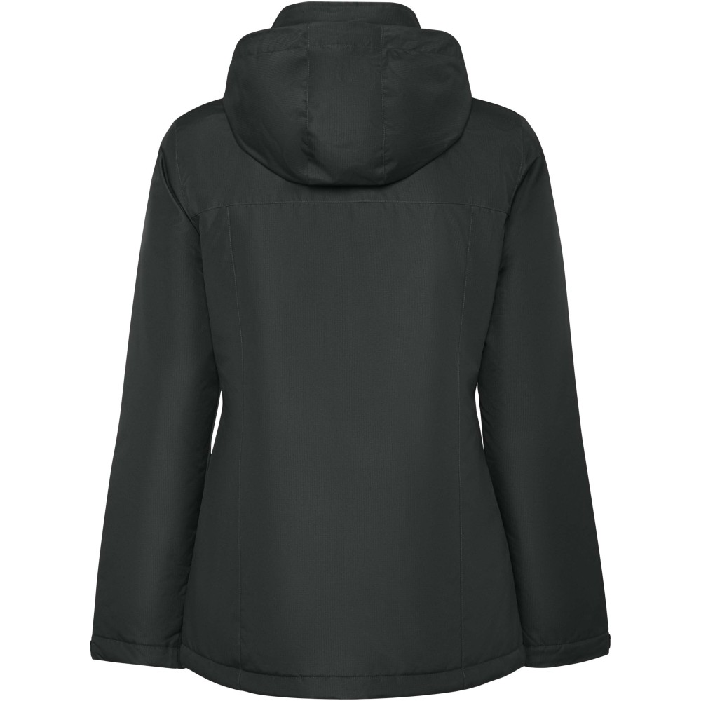 Vízálló bélelt parka nőknek. Karcsúsított fazon. Magas gallérral és levehető kapucnival, tépőzáras záródással. Oldalsó zsebek cipzárral, belső zseb tépőzáras záródással. Állítható mandzsetták tépőzáras övhurkokkal. Belső hozzáférés a hátsó és a bal mellkasi megerősítésekhez.