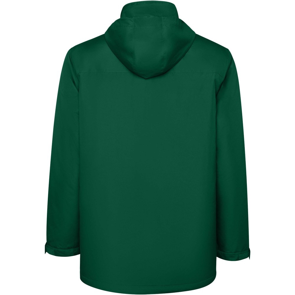 Vízálló bélelt parka férfiaknak. Magas gallérral és levehető kapucnival, tépőzáras záródással. Oldalsó zsebek cipzárral, belső zseb tépőzáras záródással. Állítható mandzsetták tépőzáras övhurkokkal. Belső hozzáférés a hátsó és a bal mellkasi megerősítésekhez.