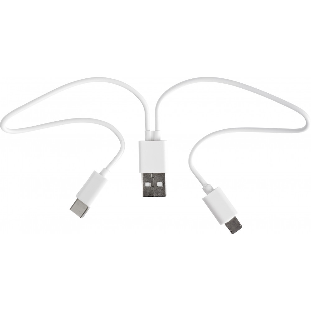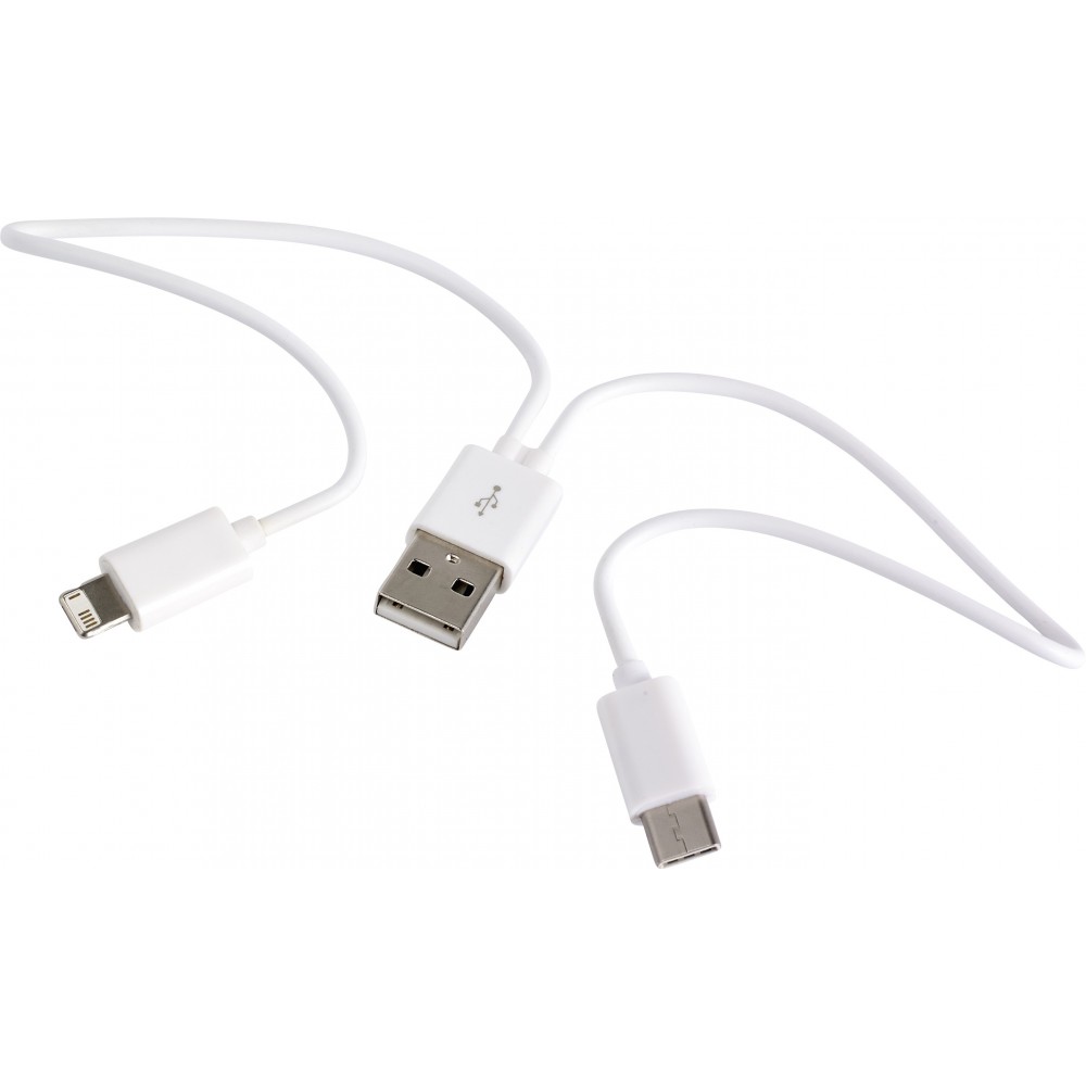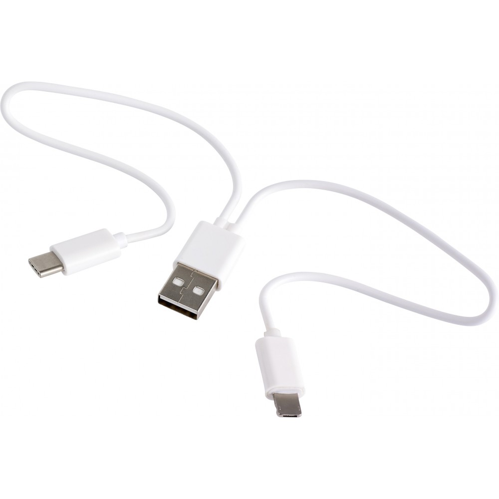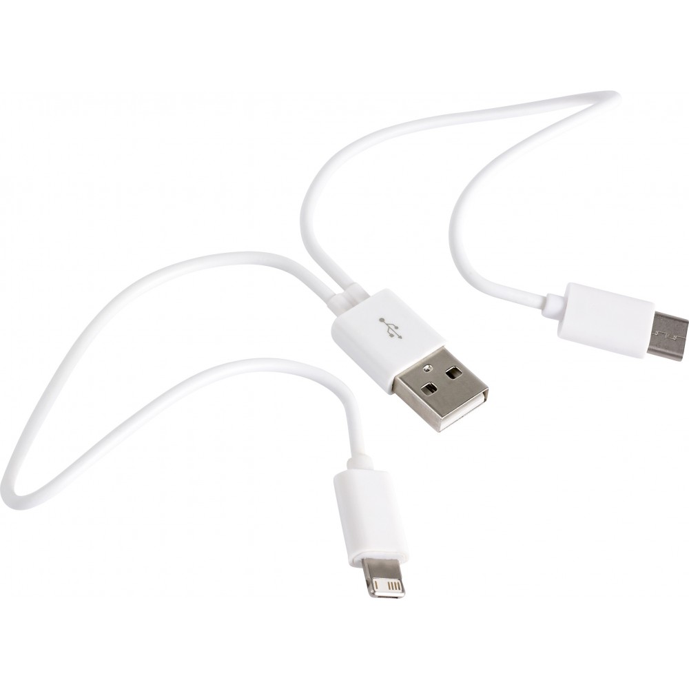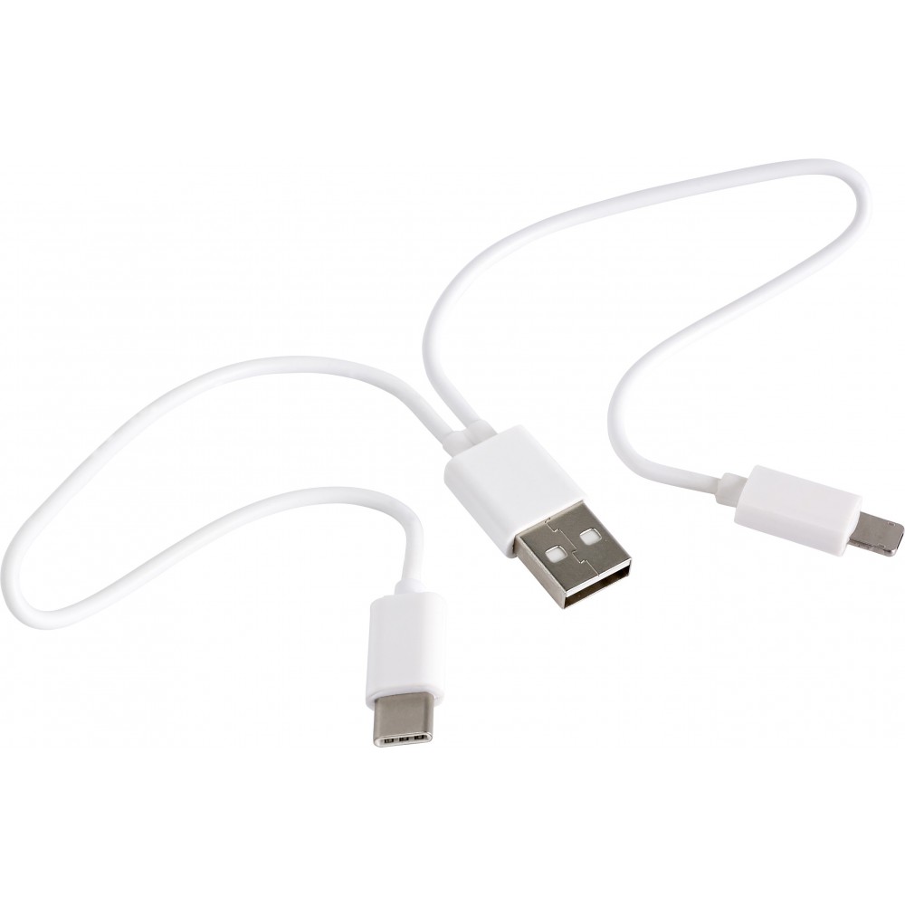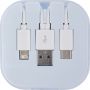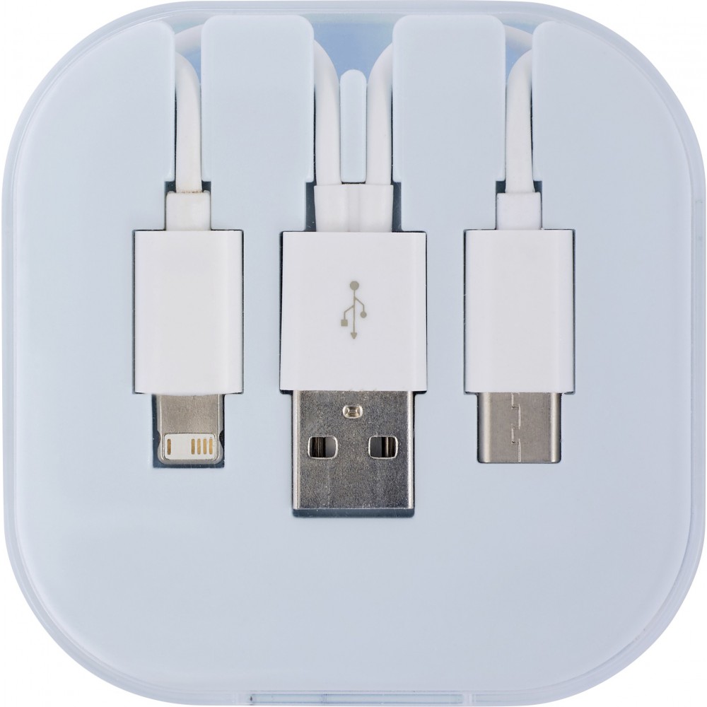 USB töltőkábel műanyag tokban. USB, USB-C és micro USB csatlakozóval rendelkezik. A micro USB csatlakozó átváltható Lightning csatlakozóra. A kábel hossza: kb. 24 cm. ABS, PVC, PS műanyag.