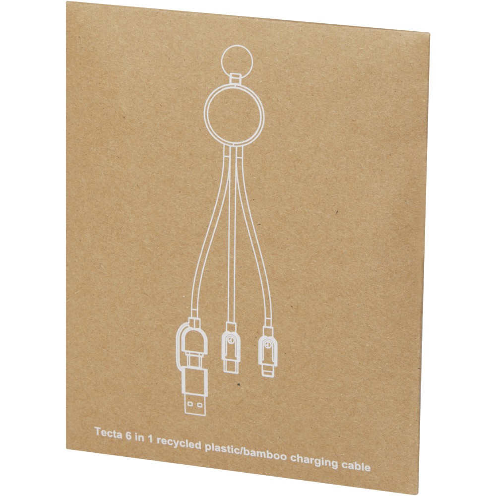 A Tecta 6 az 1-ben bambuszból és újrahasznosított műanyagból készült töltőkábel. Ez a 25 cm hosszú RTPE kábel 2A töltési teljesítményt biztosít. Bemenet: USB A és Type-C. Kimenet: Type-C, micro USB és 2 az 1-ben micro USB és Lightning dual tip iOS és Android eszközökkel is kompatibilis. Az alumínium USB-csatlakozók biztonságos és stabil kapcsolatot biztosítanak, így minden alkalommal megbízható töltést biztosítanak. Az ezüst színű, rozsdamentes acél kulcstartó kényelmes módja a kábel rendszerezésének és szállításának. Nátronpapír borítékba csomagolva.