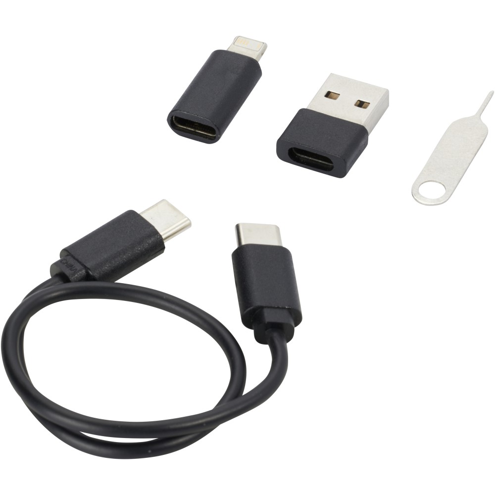 Újrahasznosított műanyagból készült moduláris adat- és töltőkábel, amelyet egy elegáns, telefonállványként is használható tárolódobozba csomagoltunk. A kábel többféle töltési megoldást kínál: C-típusú és USB-A bemenetet, valamint C-típusú/iOS/mikroUSB kimenetet. Mindezen adaptereknek és csatlakozóknak köszönhetően ez a kábel lehetővé teszi a legtöbb okostelefon, fényképezőgép, powerbank, fülhallgató, stb. töltését. A kábel maximális kimeneti teljesítménye 2A. Rendelkezik egy SIM tűvel, amely bármikor jól jön, amikor ki kell venned telefonod SIM-kártyáját. A tárolódobozban egy micro SD memóriakártya, valamint egy nano SIM-kártya tárolására is van hely, így ez a tökéletes utazási kiegészítő. Kábel hossza: 26 cm. 100%-ban újrahasznosított borítékban szállítjuk.