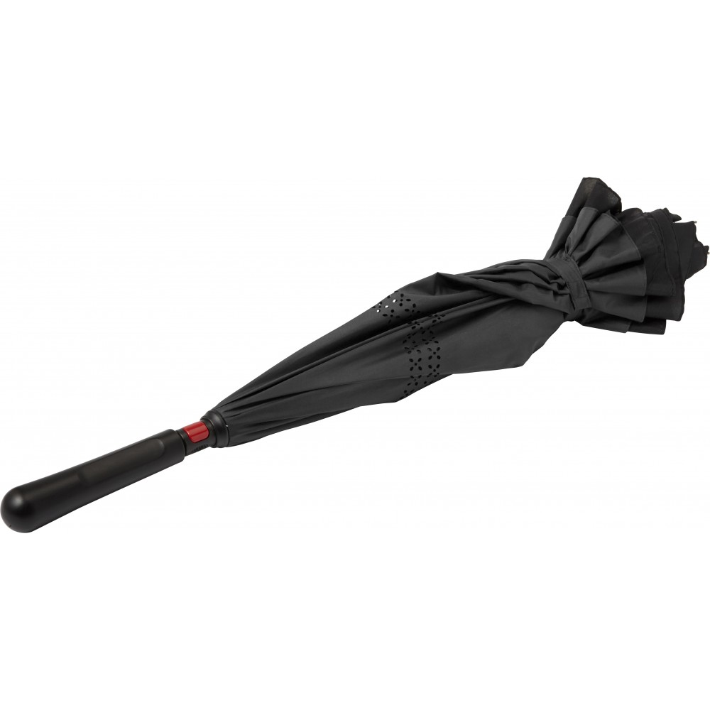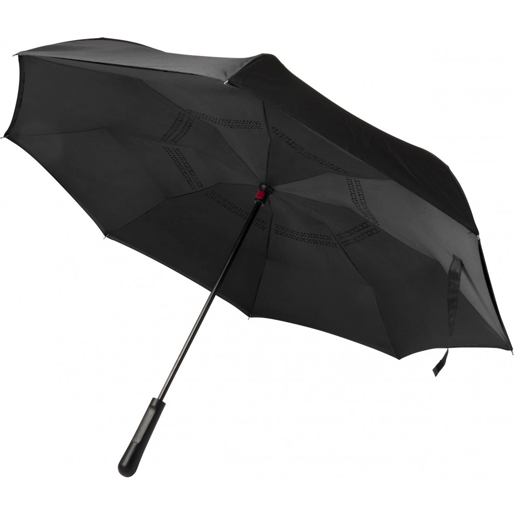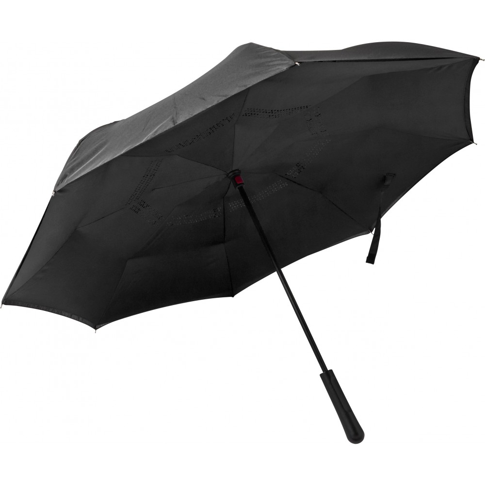 Innovatív, kiforduló szerkezetű, duplafalú esernyő, üvegszálas vázzal és műanyag fogóval. Tépőzáras.