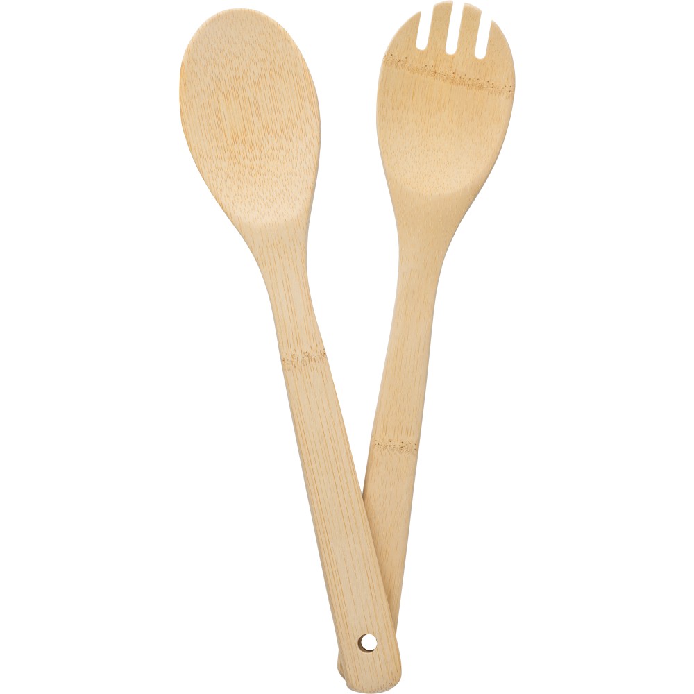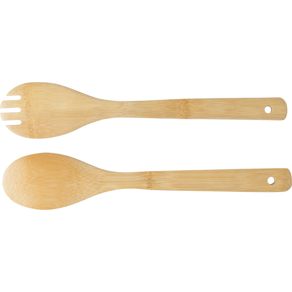 Bambusz salátás evőeszköz. Az evőeszközök nyelének végén lyukakkal van ellátva. Pamut zsinórral húzható tasakba csomagolva érkezik.