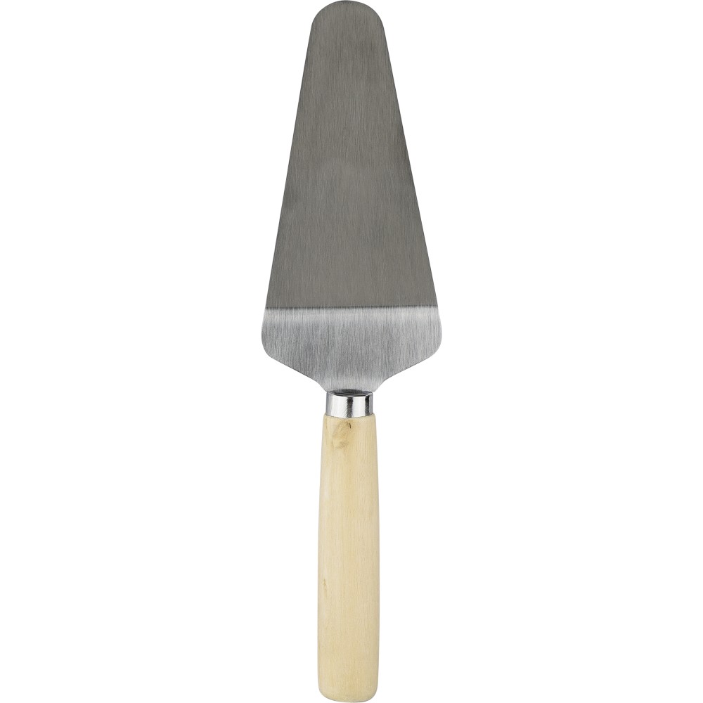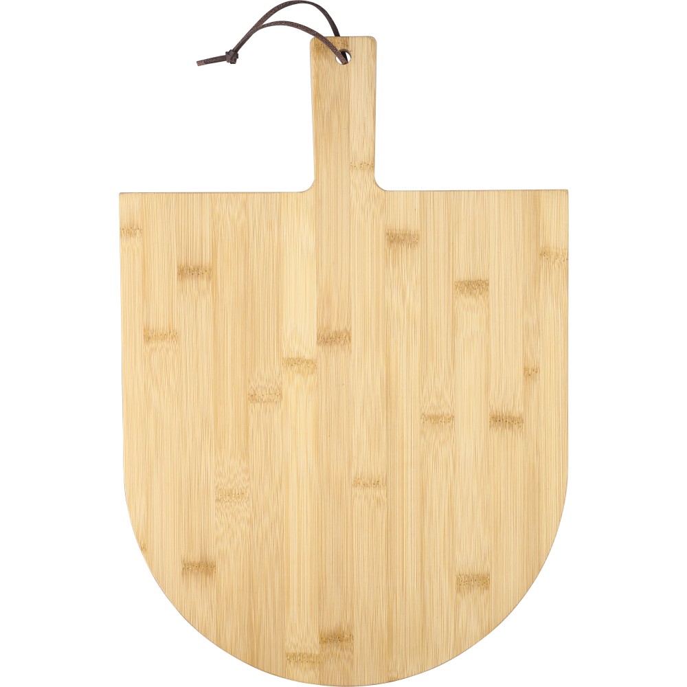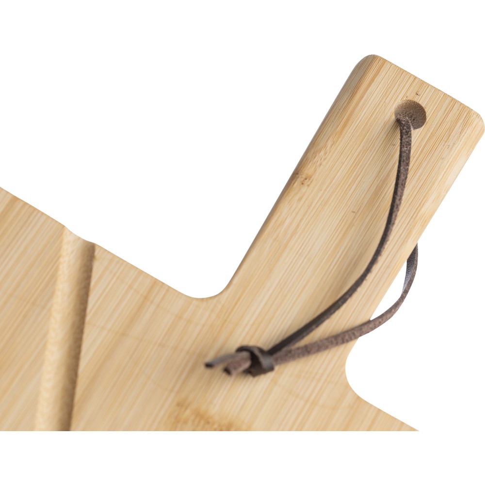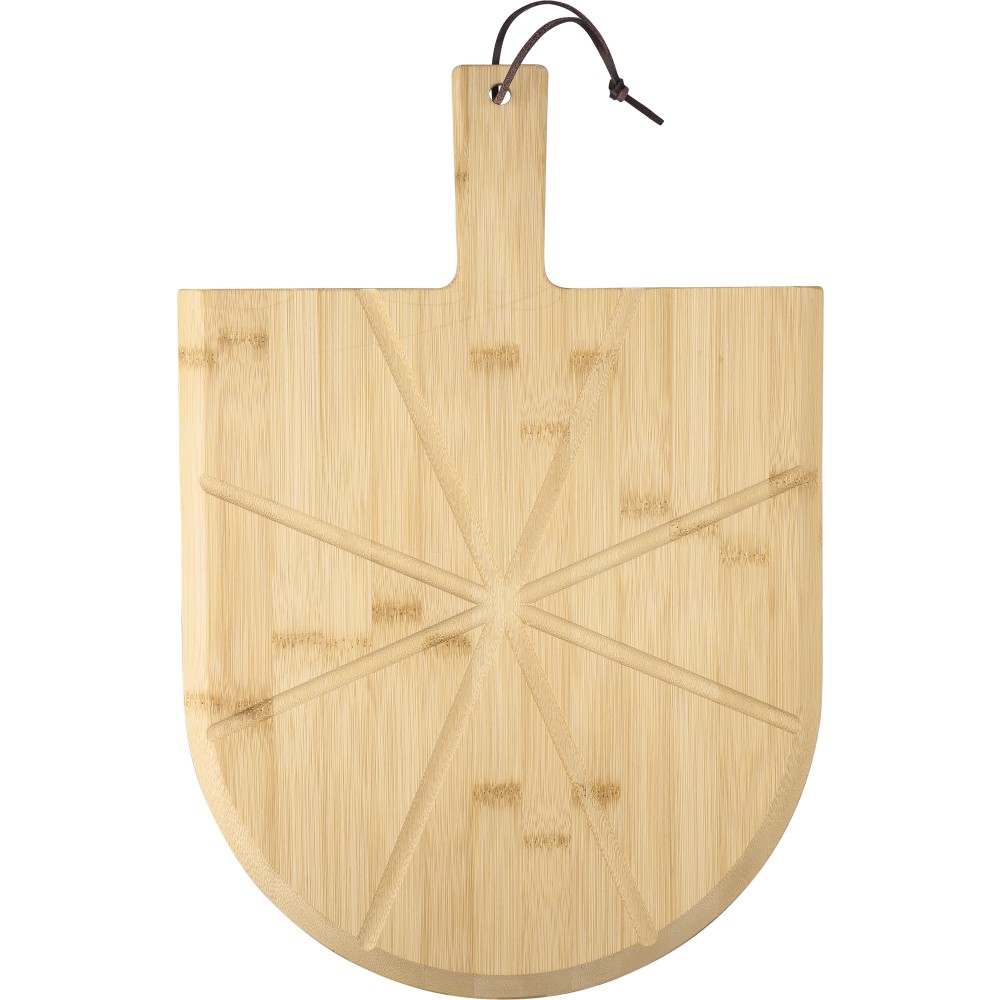 Bambusz pizzavágó deszka nyéllel és a szeletelést könnyítő barázdákkal. A készlet része egy rozsdamentes acélból és bükkfából készült pizzavágó és szervírozólapát is. A deszka nyelén PU akasztószalag található. Csomagolása barna papírdoboz.