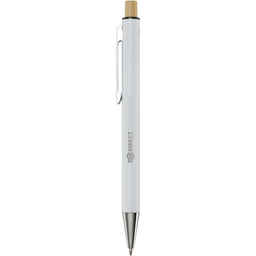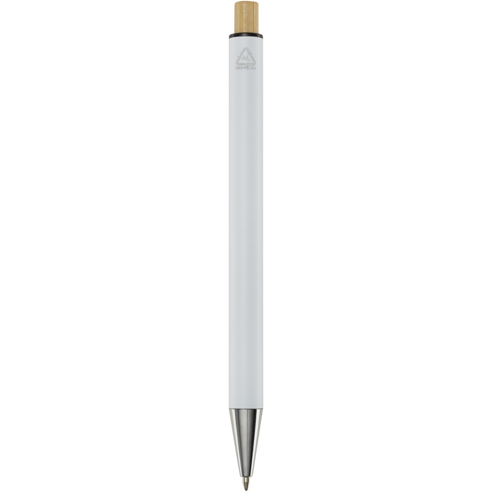 A Cyrus golyóstollújrahasznosított alumíniumból készül, ami kevesebb energiát igényel, mint az alumínium nyersanyagból történő előállítása. Emellett csökkenti a hulladéklerakókba kerülő hulladék mennyiségét és hozzájárul a természeti erőforrások megőrzéséhez, amelynek célja az üvegházhatású gázok kibocsátásának csökkentése. A nyomógomb bambuszból készült. Tollbetét színe: kék. Íráshossz: 800 méter. Tollhegy mérete: 1,00 mm.