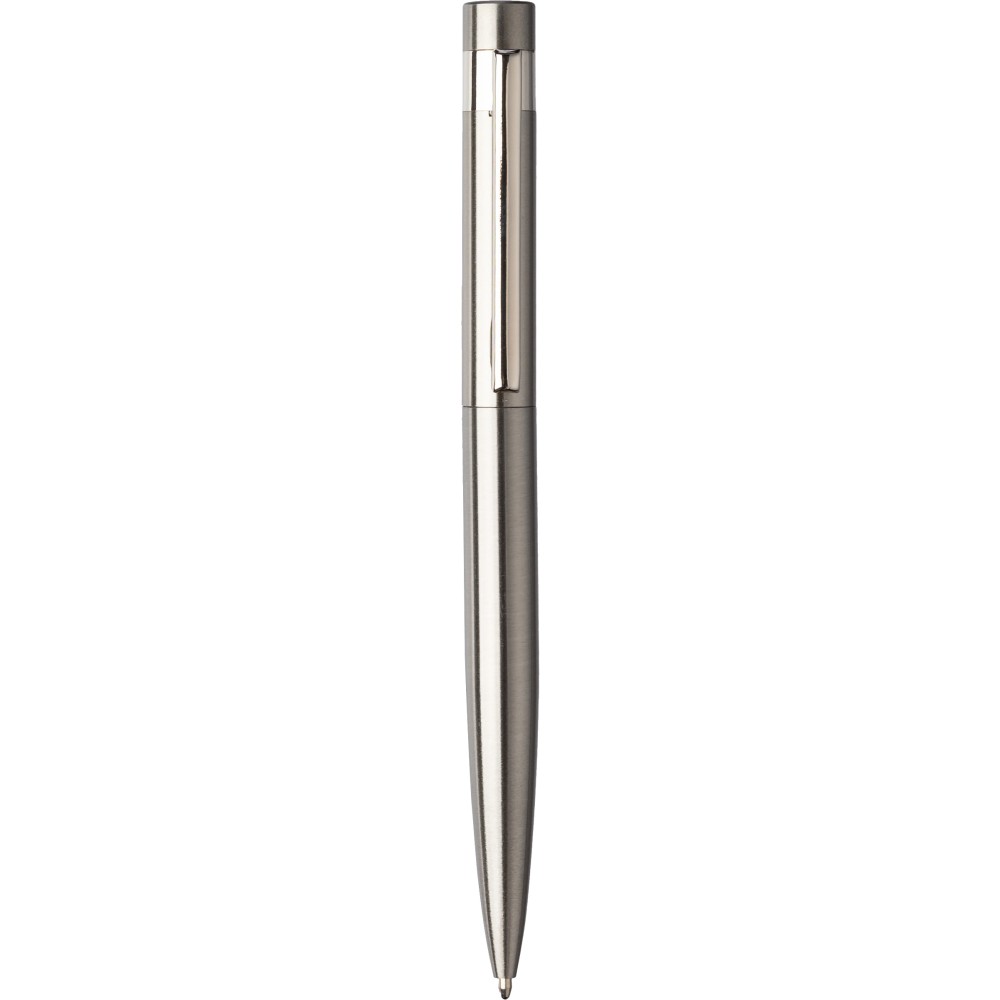 Újrahasznosított rozsdamentes acél, csavaros mechanikával rendelkező golyóstoll kék tollbetéttel. A toll hátoldalán az újrahasznosított rozsdamentes acél alapanyagot jelző logó található. Csomagolása nátronpapír díszdoboz.