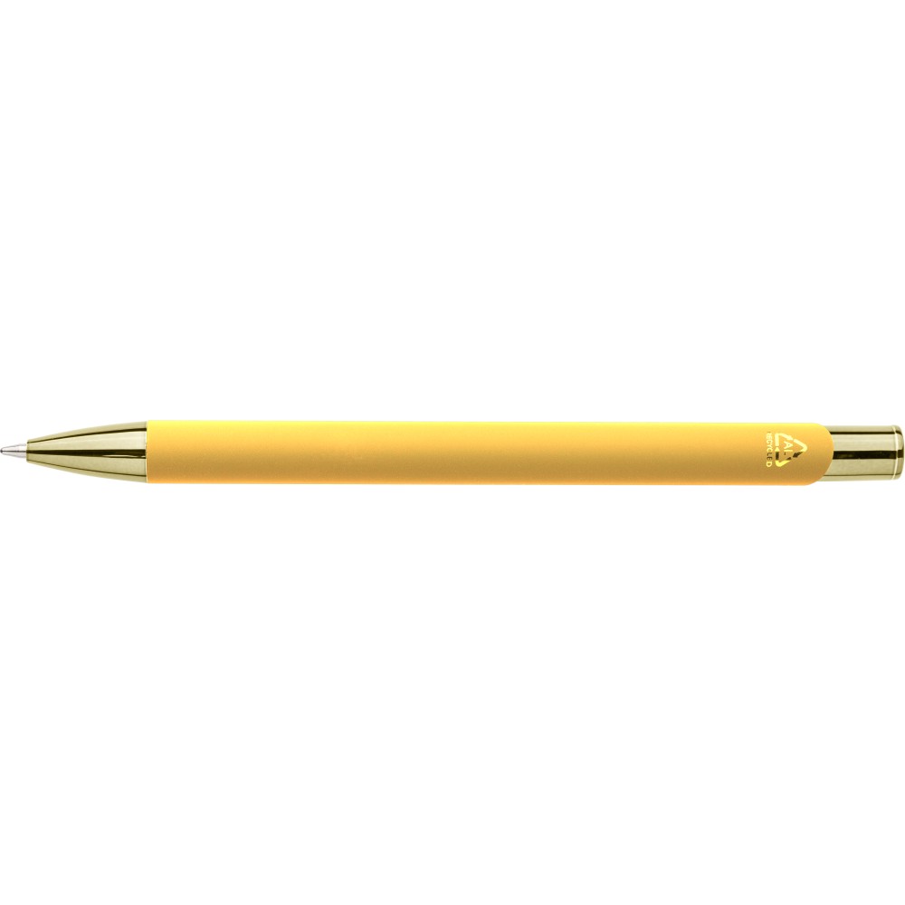 Újrahasznosított alumíniumból készült, gumírozott felületű golyóstoll, a toll színével harmonizáló UV-bevonatú műanyag és fém díszítéssel. Gravírozás után fényes tükörhatás jelenik meg. A tolltesten gravírozott recycled (újrahasznosított) alapanyagra utaló logó található. Megközelítőleg 800 méter íráshosszúságú, kék színű tollbetéttel.