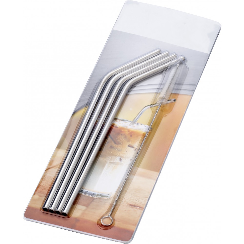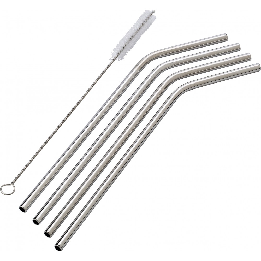 Négy rozsdamentes acél, környezetbarát, sokszor használatos szívószál. A készlet tartalmaz egy tisztítókefét.