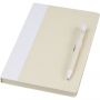 A5 méretű füzet és golyóstoll készlet. A jegyzetfüzet 80 vonalas lapot (80 g/m2) tartalmaz, amelyek újrahasznosított tejes kartondobozokból készülnek (akár 70%), színes papírgerinccel és egy tollhurokkal. A tollhurokban egy nyomógombos golyóstoll található a jegyzetfüzet színéhez illő színben. A toll teste ugyanabból az újrahasznosított anyagból készült, a gomb, a klipsz és a hegy pedig színes PLA műanyagból készült. A toll fekete tollbetéttel érkezik. A használt tejesdobozokat összegyűjtik, válogatják, feldolgozzák és papírrá alakítják, így a hulladékból hasznos termék készül.