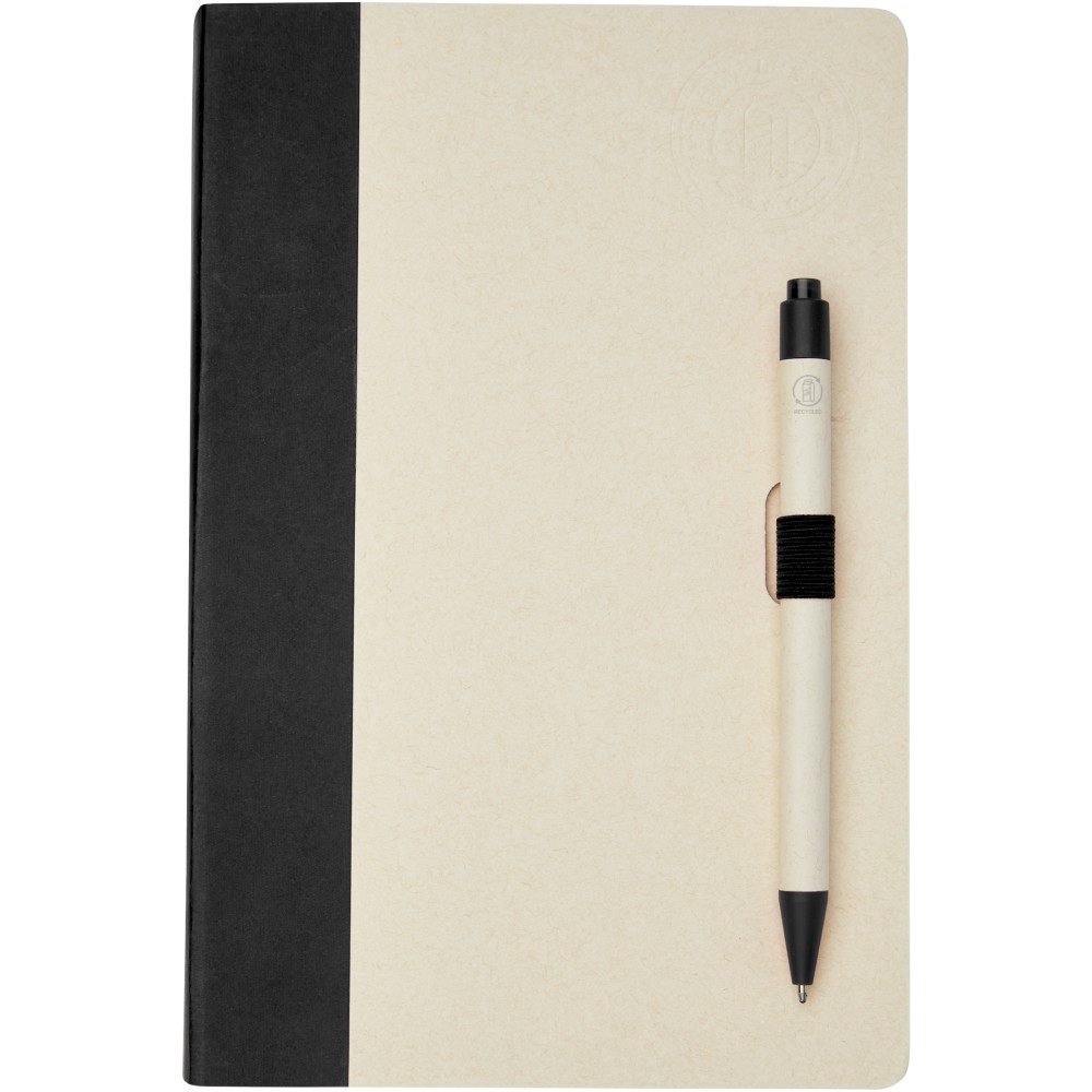 A5 méretű füzet és golyóstoll készlet. A jegyzetfüzet 80 vonalas lapot (80 g/m2) tartalmaz, amelyek újrahasznosított tejes kartondobozokból készülnek (akár 70%), színes papírgerinccel és egy tollhurokkal. A tollhurokban egy nyomógombos golyóstoll található a jegyzetfüzet színéhez illő színben. A toll teste ugyanabból az újrahasznosított anyagból készült, a gomb, a klipsz és a hegy pedig színes PLA műanyagból készült. A toll fekete tollbetéttel érkezik. A használt tejesdobozokat összegyűjtik, válogatják, feldolgozzák és papírrá alakítják, így a hulladékból hasznos termék készül.