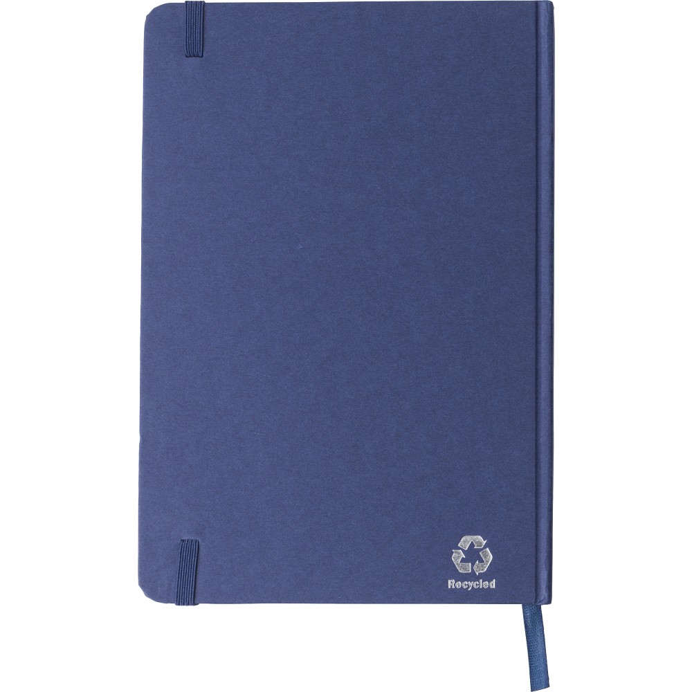 Újrahasznosított kartonból készült A5-ös jegyzetfüzet 80 vonalas lappal. Gumis záródás és könyvjelző szalag.