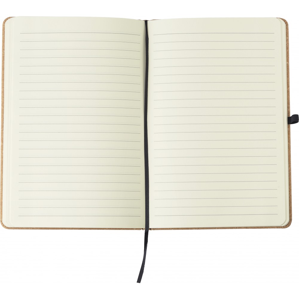 Újrahasznosított bőrből készült A5-ös jegyzetfüzet 100 vonalas lappal. Gumis záródás, tollhurok és könyvjelző szalag. Hátoldalán az újrahasznosított anyagra utaló logónyomat látható.