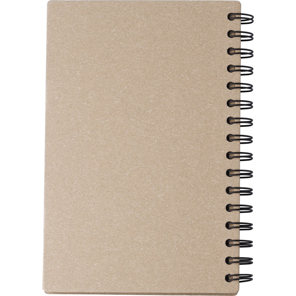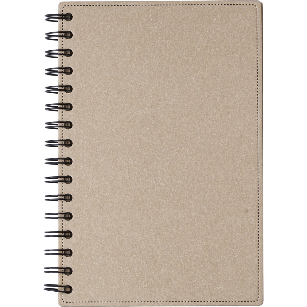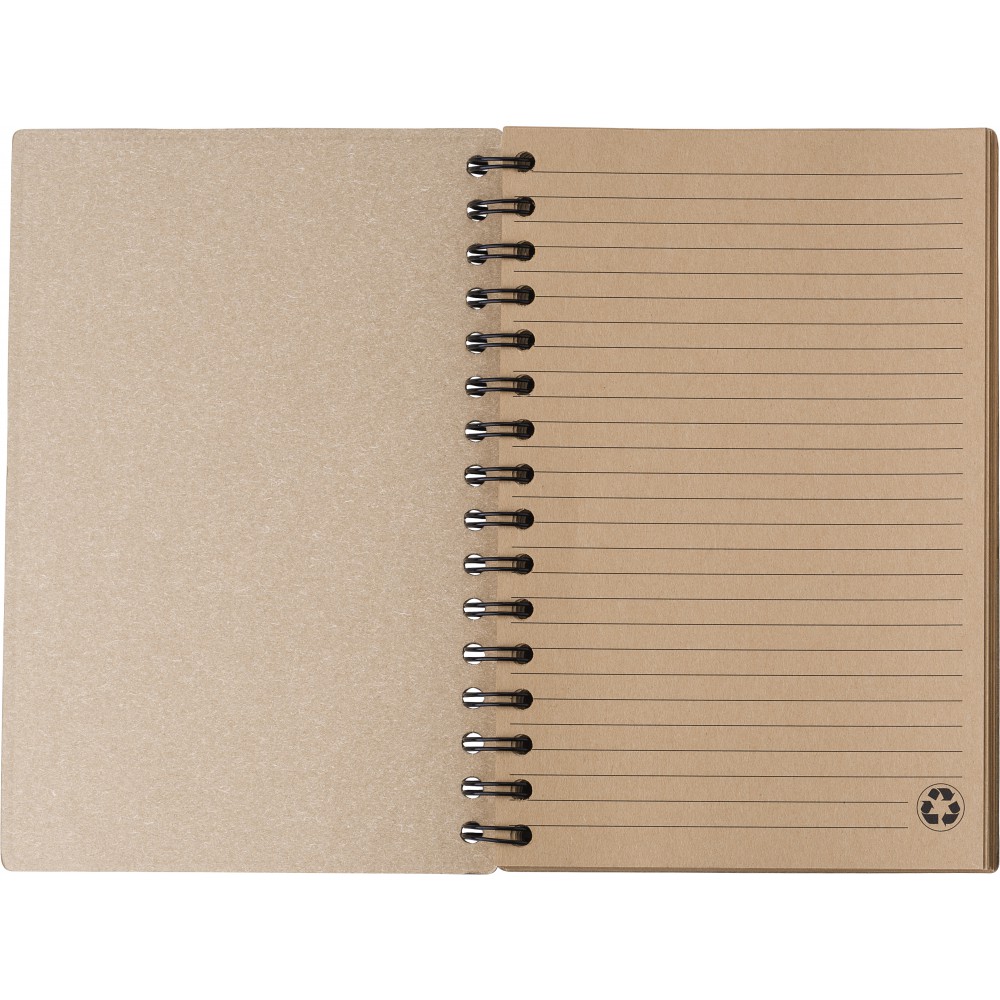 Újrahasznosított kartonból készült, keményfedeles spirálfüzet 80 vonalas, újrahasznosított barna papírlappal. Lapok minősége: 65 g/m2. Az újrahasznosított alapanyagra utaló logó minden lapon látható.