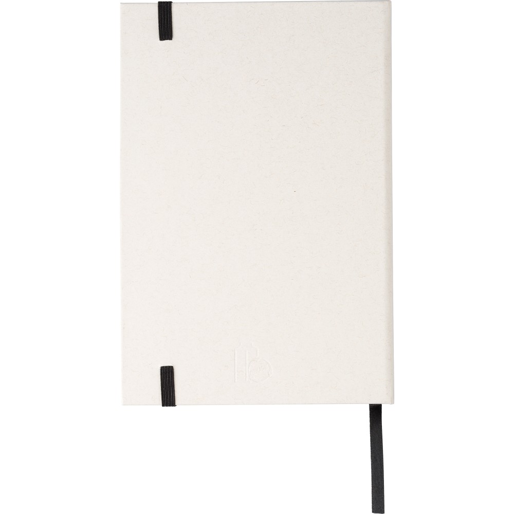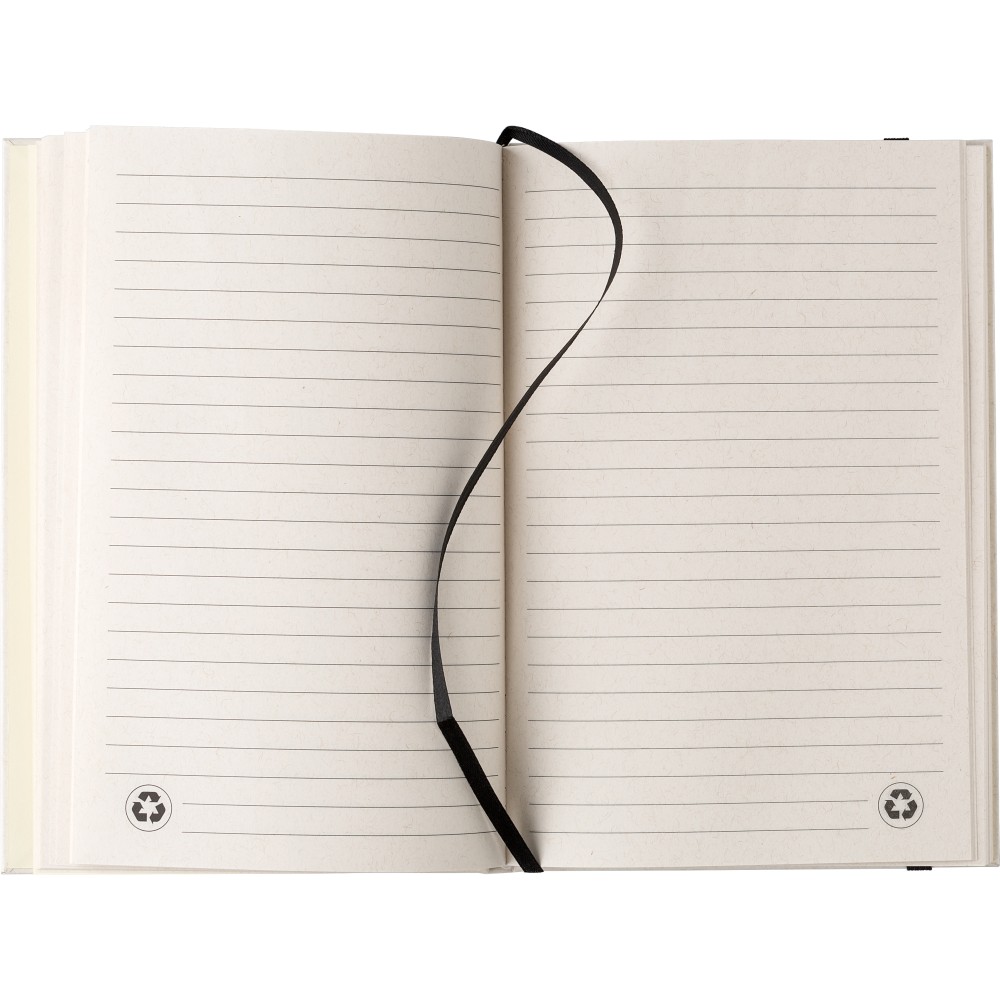Újrahasznosított tejesdobozból készült A5-ös jegyzetfüzet 80 lappal, gumiszalaggal és könyvjelzővel. 70%-ban újrahasznosított tejeskartonból és 30%-ban újrahasznosított papírból készült. Igazolóbélyegző a füzet hátuljának az alján.