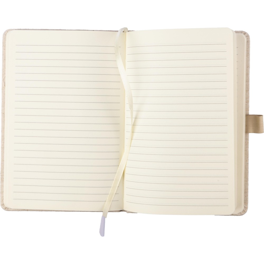 Kenderből készült jegyzetfüzet (kb. A5-ös méret) 80 lappal, tollhurokkal, gumis záródással és hozzáillő natúr színű könyvjelzővel. A borító hátoldalán kender alapanyagot jelző logó.