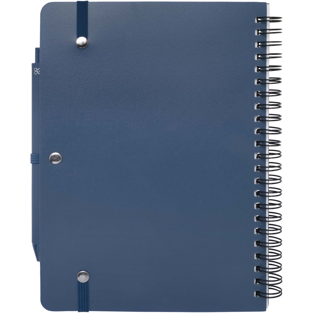 Thalaasa A5 keményfedeles jegyzetfüzet óceánból származó újrahasznosított műanyagból készült, és 80 vonalas, 70 g/m2 krémszínű lapot tartalmaz. A jegyzetfüzet lekerekített sarkokkal, elasztikus zárással és tolltartóval rendelkezik. A fekete tintával író golyóstoll szintén óceánból származó újrahasznosított műanyagból készült. Íráshossz: 1000 méter. Tollhegy mérete: 1,0 mm.