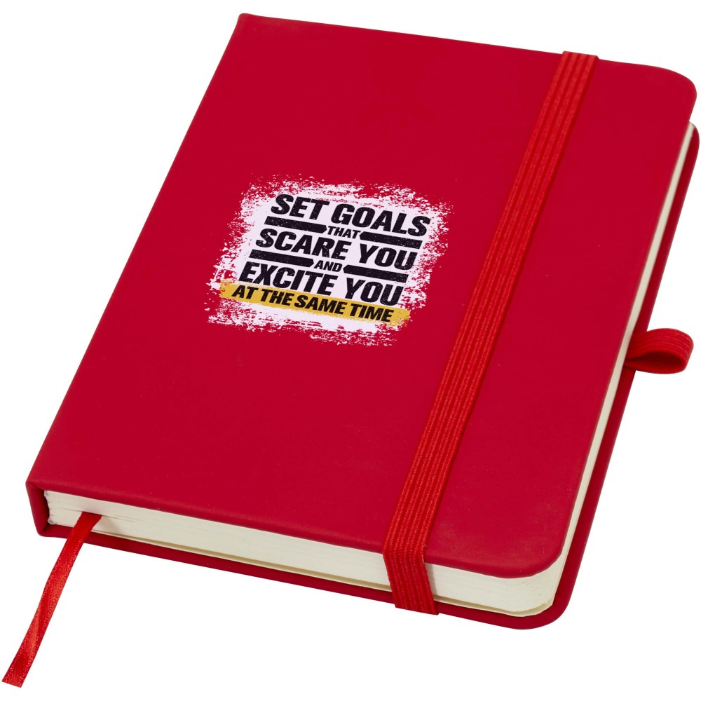 A Spectrum Plus A6 keményfedeles jegyzetfüzet lekerekített sarkokkal nemcsak az irodai mindennapok elengedhetetlen kelléke, hanem remek lehetőség márkád népszerűsítésére is. A jegyzetfüzet puha tapintású borítóval rendelkezik és 80 vonalas, krémszínű, 70 g/m2-es lapból áll, amely tökéletes gyors ötletek vagy hosszabb jegyzetek rögzítésére. A jegyzetfüzet tolltartó hurokkal, gumiszalagos záródással, könyvjelzővel és harmonikazsebbel van ellátva.