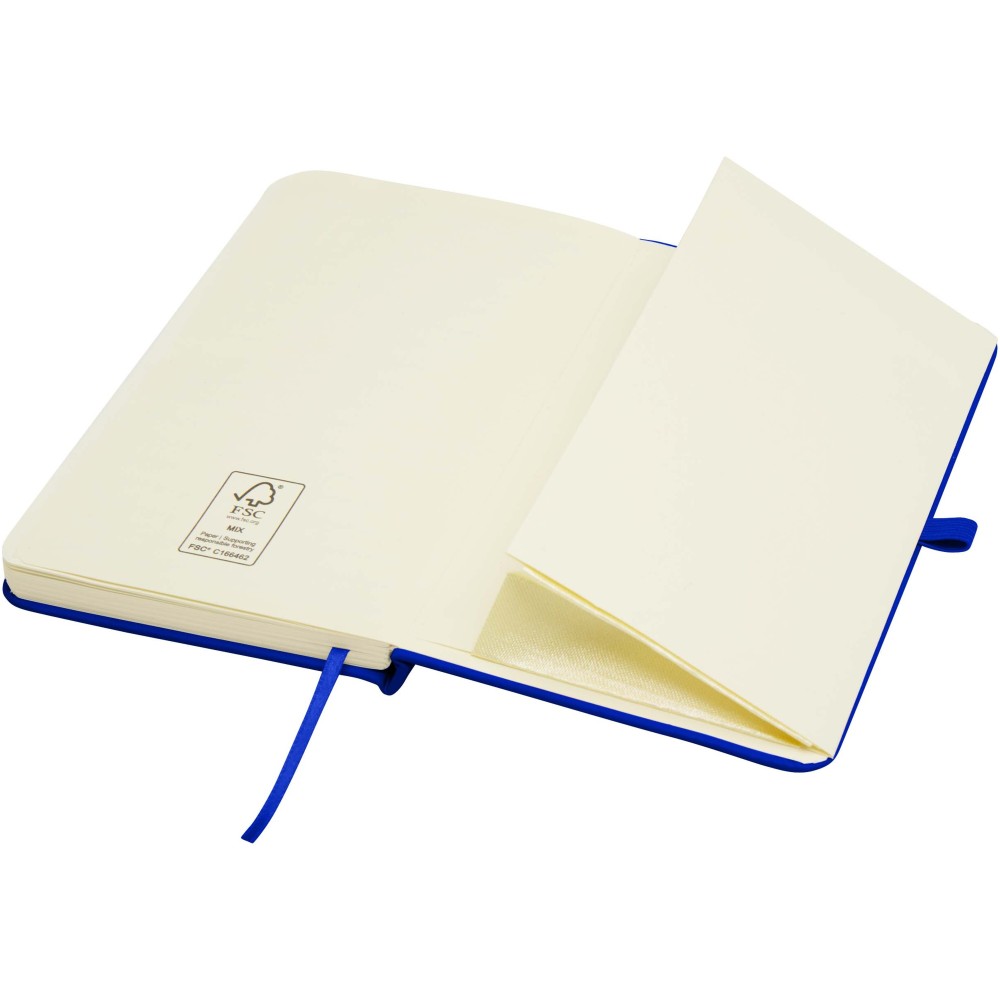A Spectrum Plus A6 keményfedeles jegyzetfüzet lekerekített sarkokkal nemcsak az irodai mindennapok elengedhetetlen kelléke, hanem remek lehetőség márkád népszerűsítésére is. A jegyzetfüzet puha tapintású borítóval rendelkezik és 80 vonalas, krémszínű, 70 g/m2-es lapból áll, amely tökéletes gyors ötletek vagy hosszabb jegyzetek rögzítésére. A jegyzetfüzet tolltartó hurokkal, gumiszalagos záródással, könyvjelzővel és harmonikazsebbel van ellátva.