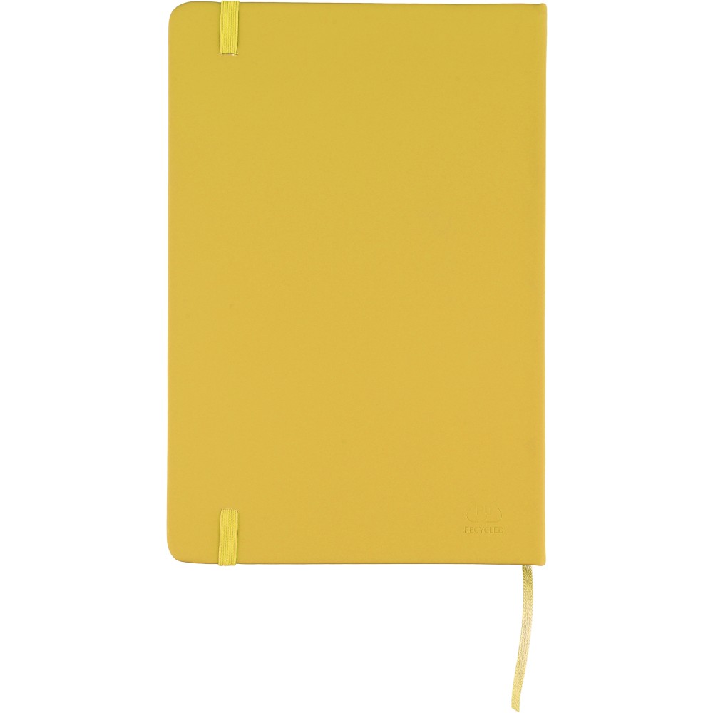 A5-ös méretű jegyzetfüzet rPET PU anyagból készült kemény borítóval, 80 vonalas lappal (70g/m2), színben illeszkedő gumipánttal és könyvjelző szalaggal. Az újrahasznosított anyagra utaló dombornyomott logóval a füzet hátoldalán.