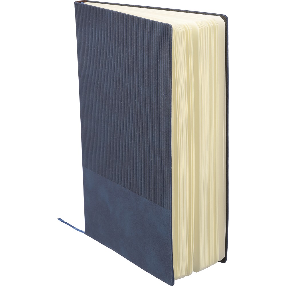 Újrahasznosított PU jegyzetfüzet, kb. A5-ös méretű, 100 lapos. Kemény borítóval és kordbársony hatású bevonattal az elülső és a hátlap felső részén. Tartalmaz egy szalagos könyvjelzőt és 80 g/m2-es vonalas lapokat. A hátoldalon dombornyomott újrahasznosított logóval.