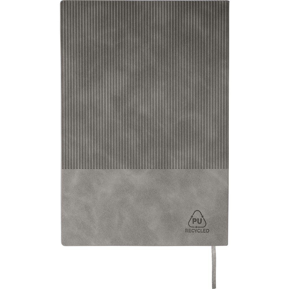 Újrahasznosított PU jegyzetfüzet és golyóstoll szett. A jegyzetfüzet kb. A5-ös méretű, 100 lapos, 80 g/m2-es vonalas lapokkal és szalagos könyvjelzővel, kordbársony hatású borítóval és dombornyomott újrahasznosított logóval rendelkezik. A golyóstoll gumírozott felülettel, csíkos markolattal, krómozott heggyel és lézergravírozott újrahasznosított logóval rendelkezik. Erős barna kartondobozban, EVA betéttel. Kék tollbetéttel szállítjuk.