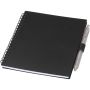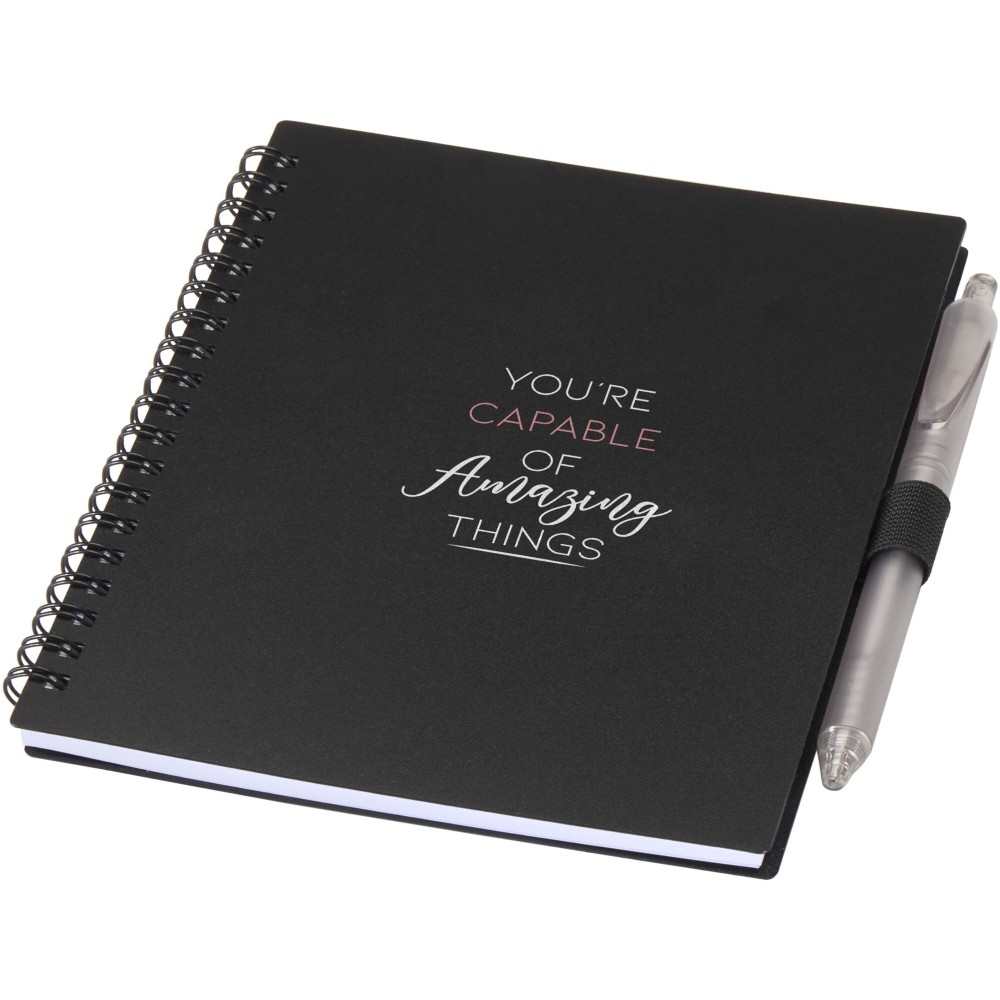A Niove puhafedeles jegyzetfüzet újrahasznosított műanyagból készült, 70 darab, pontozott, 70 g/m2 papírlappal. A jegyzetfüzet sarkai lekerekítettek, és tolltartóhurokkal rendelkezik. Mérete: 140 × 178 mm. A golyóstoll szintén újrahasznosított műanyagból készült. Tollbetét színe: kék. Íráshossz: 1000 méter. Hegyméret: 1,0 mm.