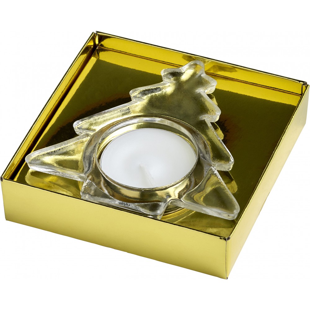 Fenyő alakú üveg gyertyatartó mécsessel. Csomagolása ajándékdoboz.