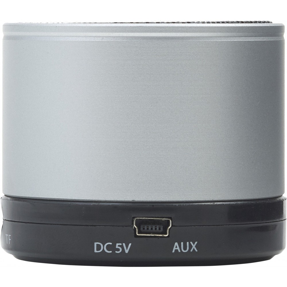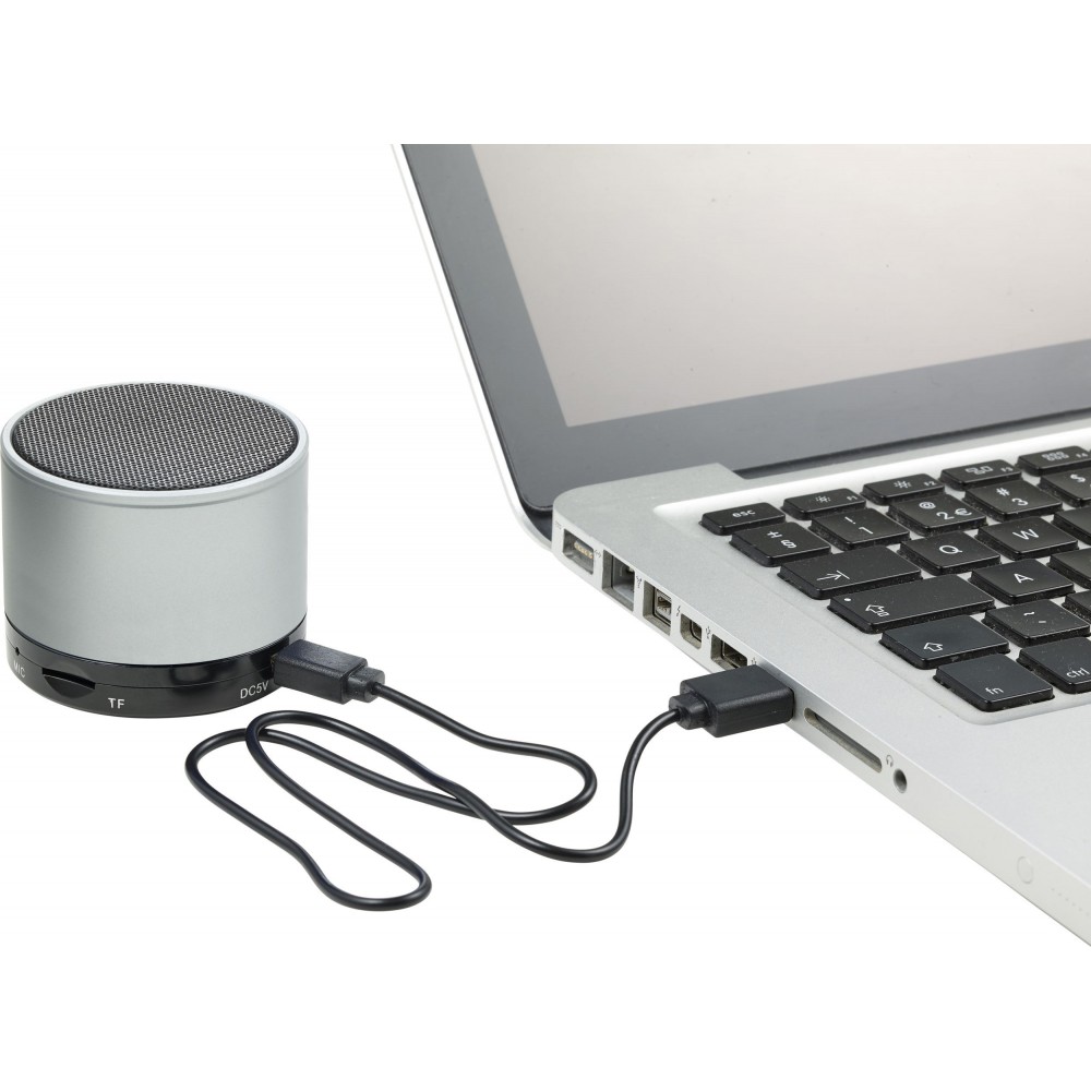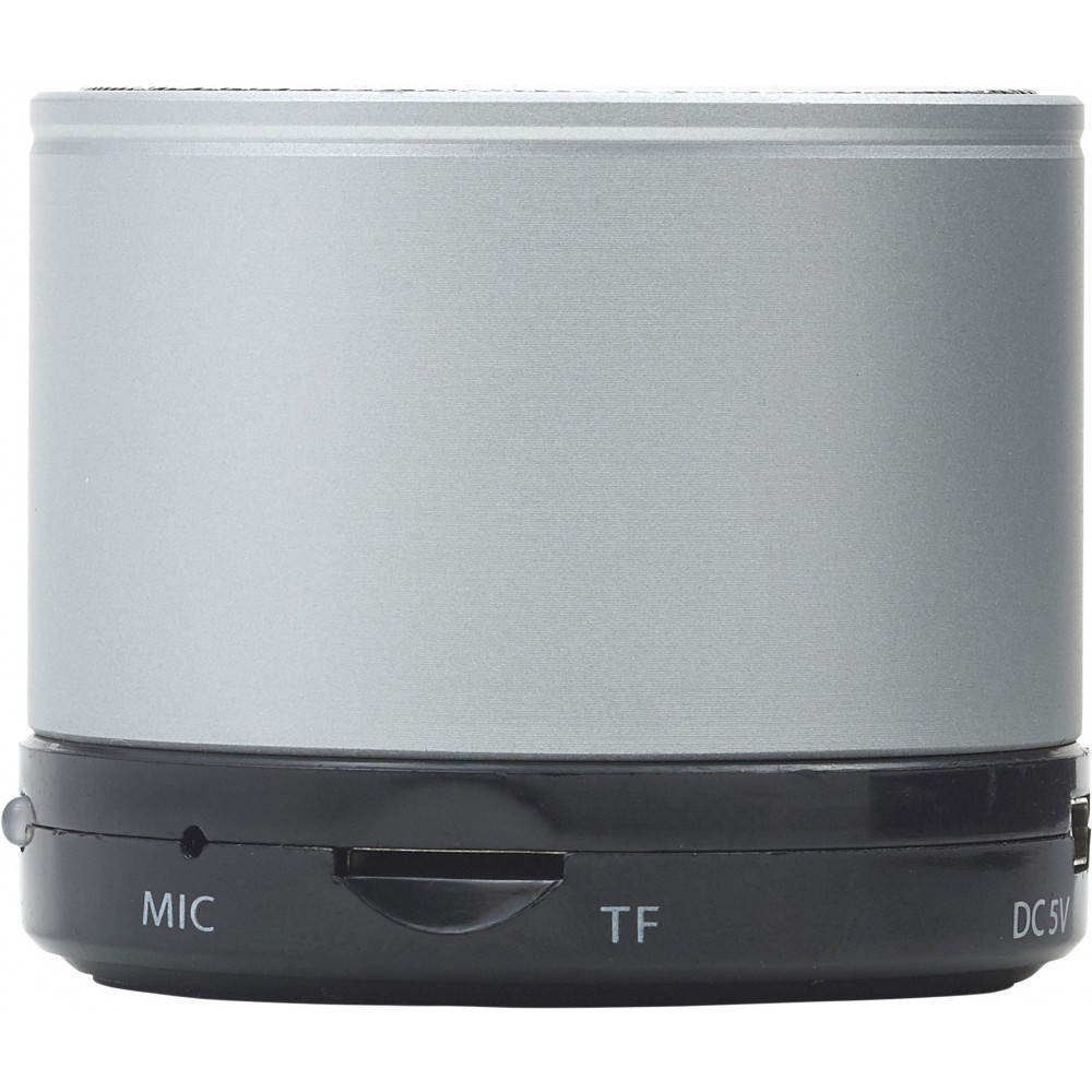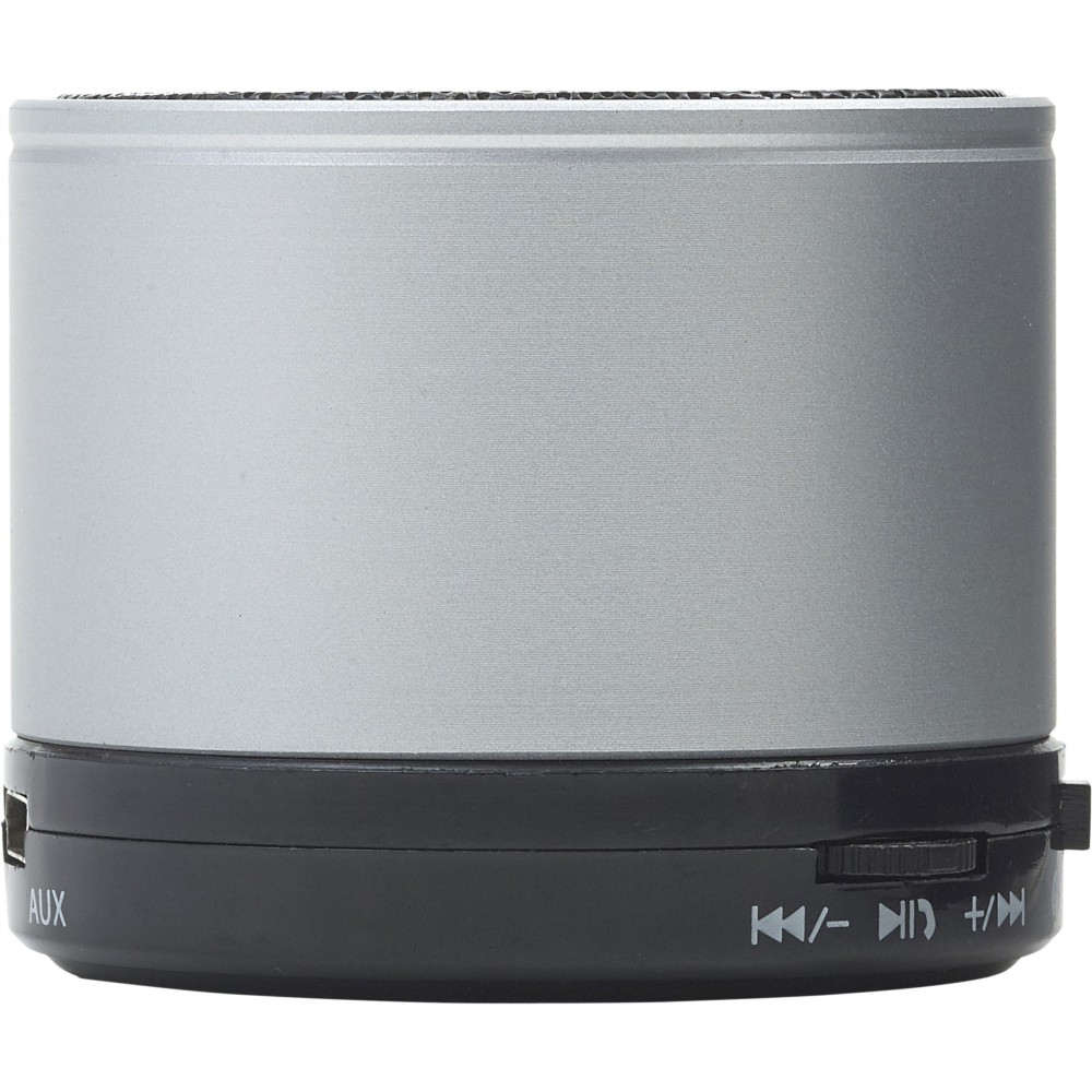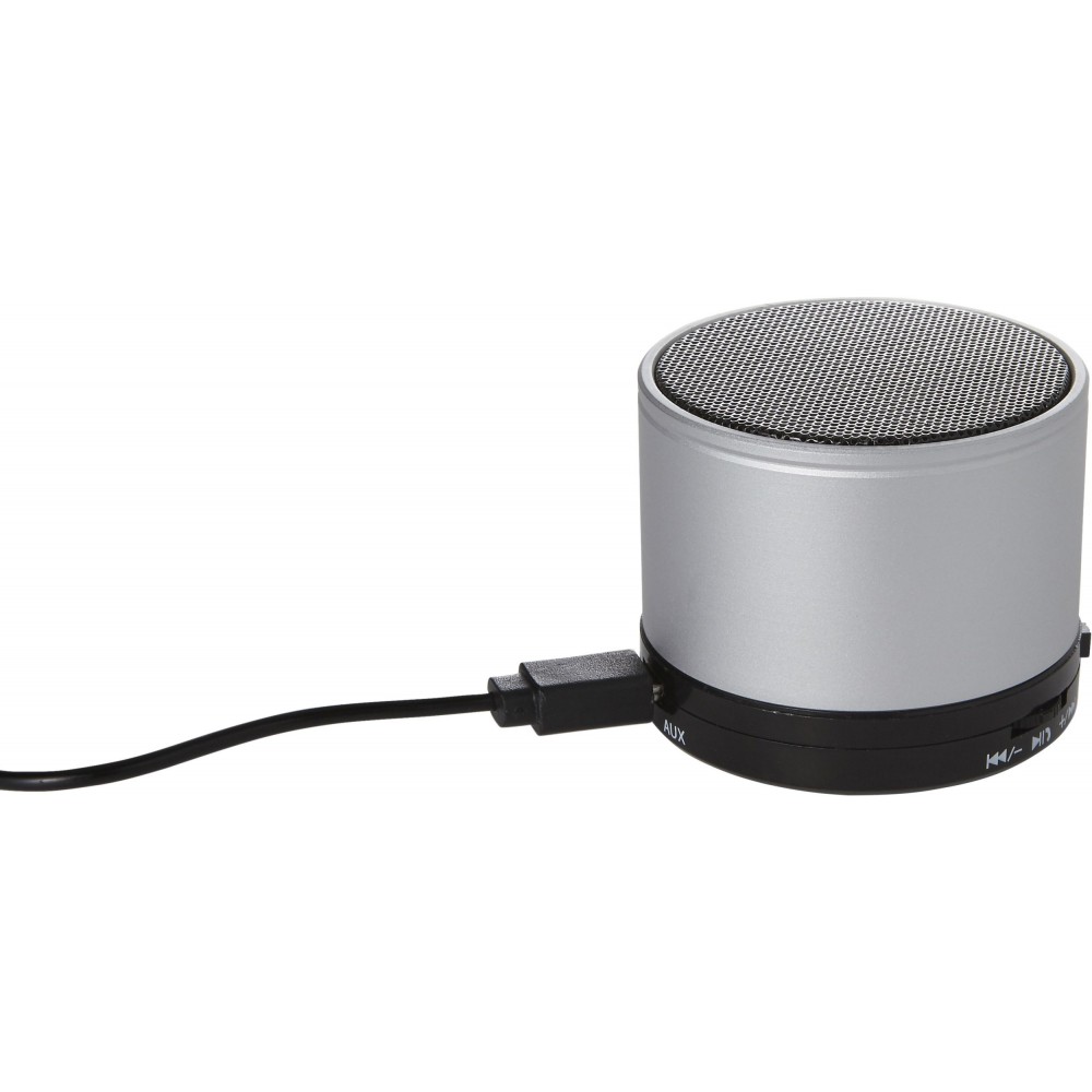 Vezeték nélküli hangszóró hangerő szabályozóval, előre- és visszaléptető gombbal, valamint módválasztó gombbal: MP3, vezeték nélküli mód és kikapcsolás. A töltőkábelt tartalmazza. Színezett fém anyag.