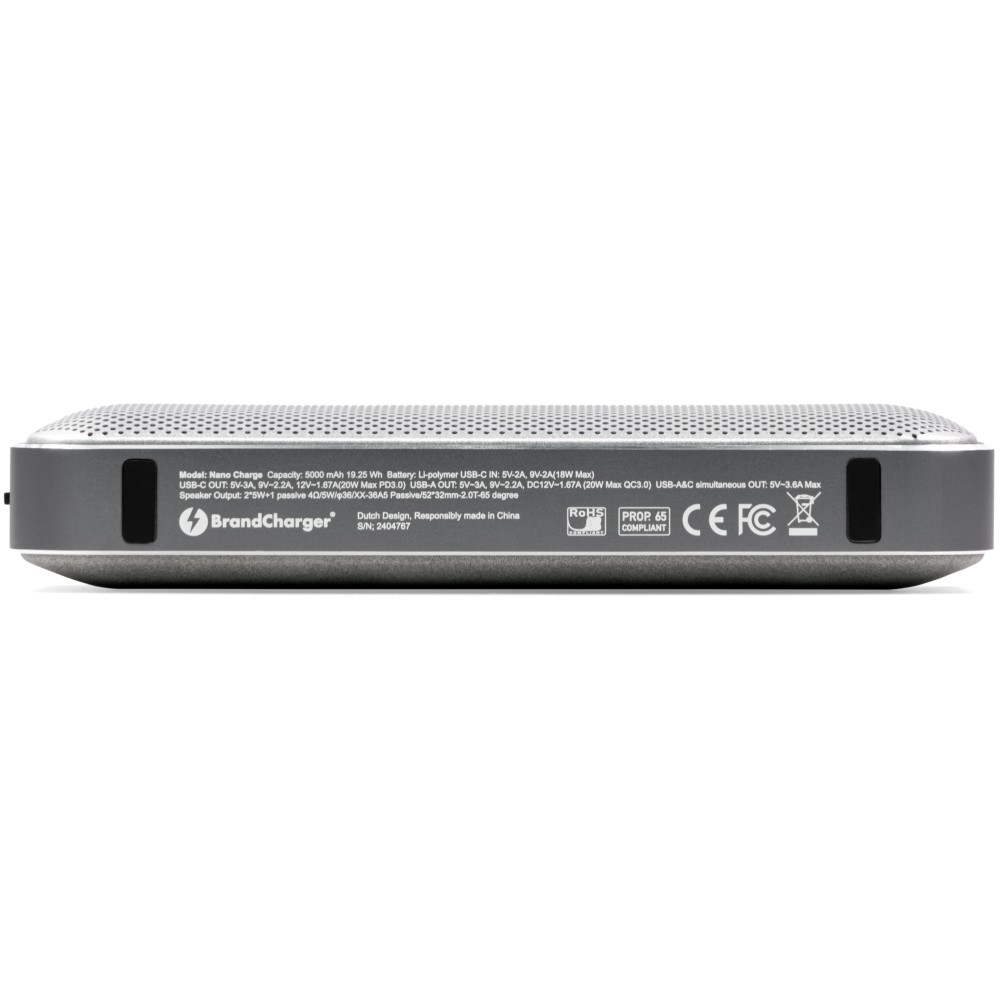 BrandCharger kompakt vezeték nélküli hangszóró és 5.000 mAh-s powerbank 10W-os Ambient Harmonics™ rendszerű hangszóróval. 20W-ig támogatja a gyorstöltést (PD3.0/QC3.0). Alumínium szünet-, lejátszás- és hangerőgombokkal. Bluetooth és usb-c kompatibilis.