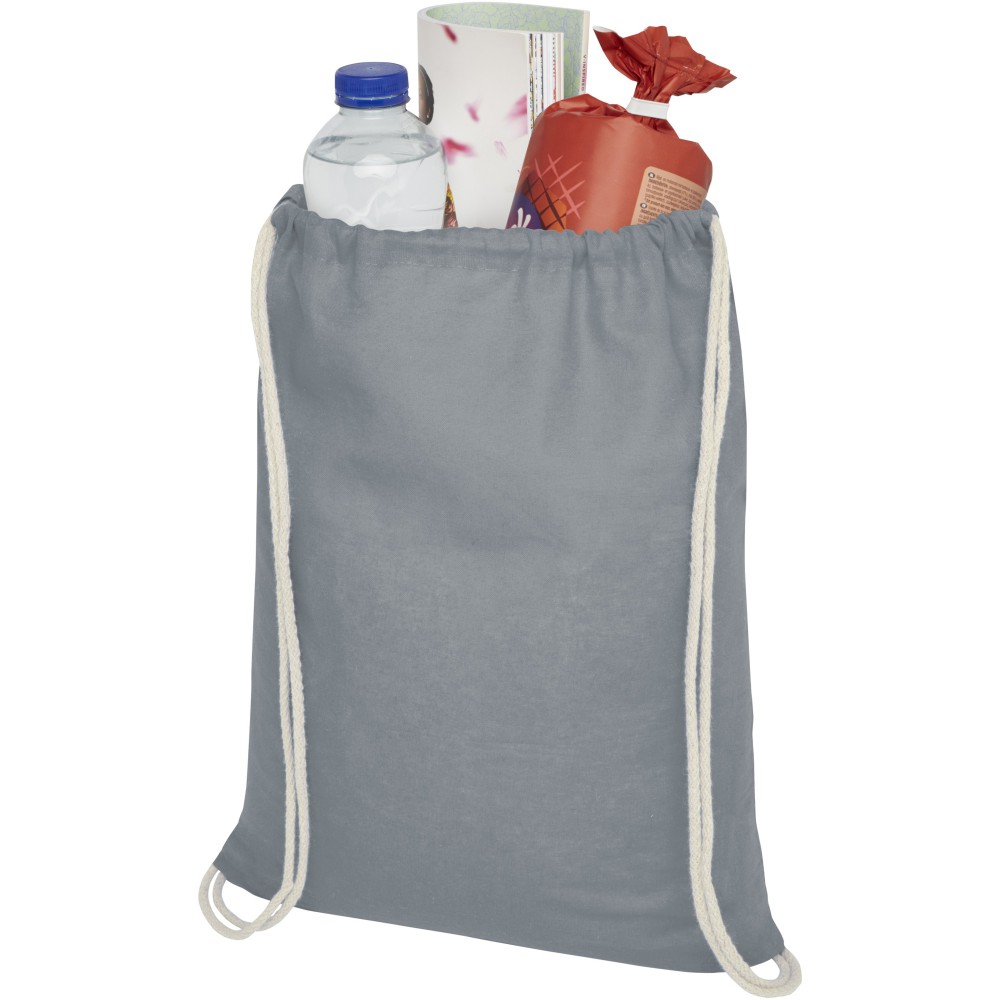 Húzózsinórral zárható nyitott fő rekesz. 100 g/m2 pamut.