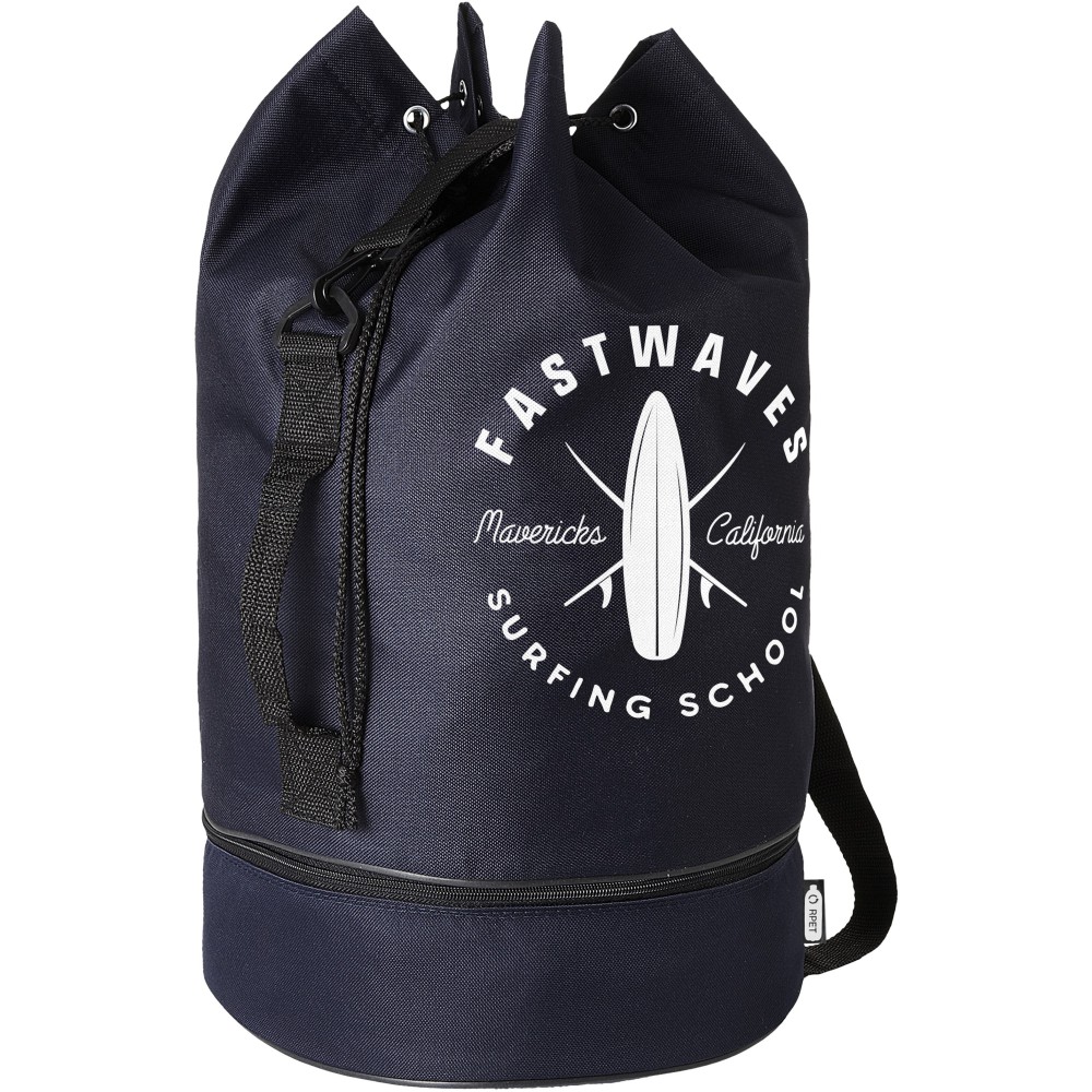 Vízálló tengerészzsák újrahasznosított PET műanyagból, tágas, 20 literes fő rekesszel, húzózsinórral, oldalfogantyúval és állítható vállpánttal. Külön cipzáras alsó rekesszel is rendelkezik a kisebb tárgyak számára.