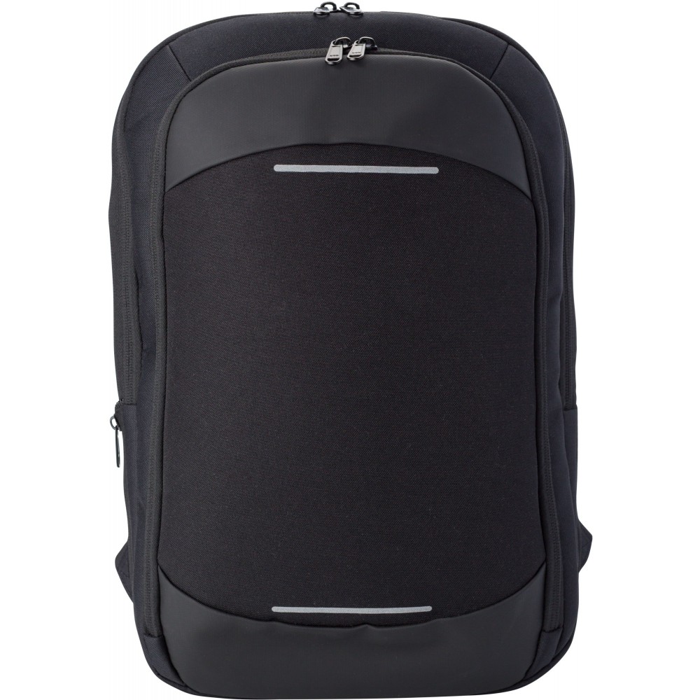 Hátizsák cipzáros elsőzsebbel, állítható, párnázott vállpánttal. Hátoldalán rejtett zseb, elöl fényvisszaverő csíkok. 600D poliészter.