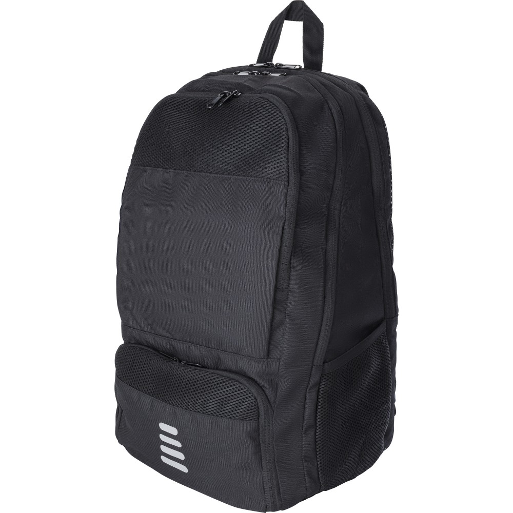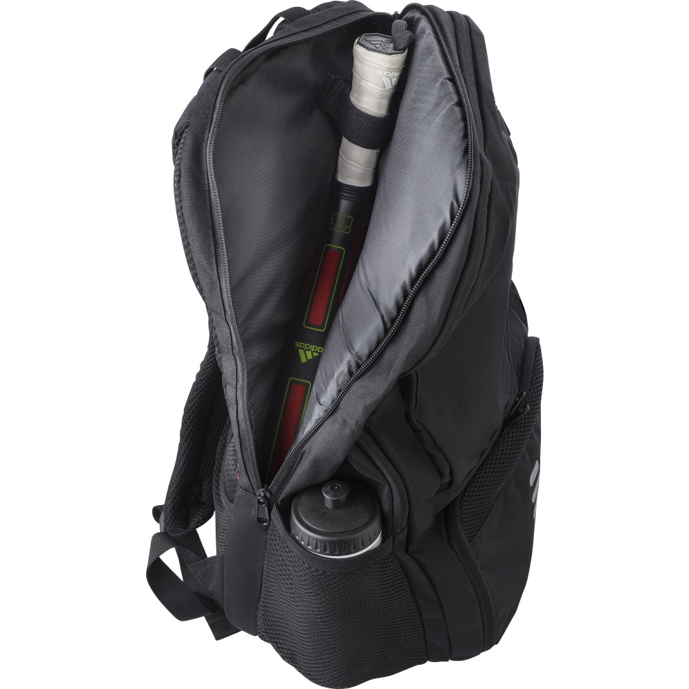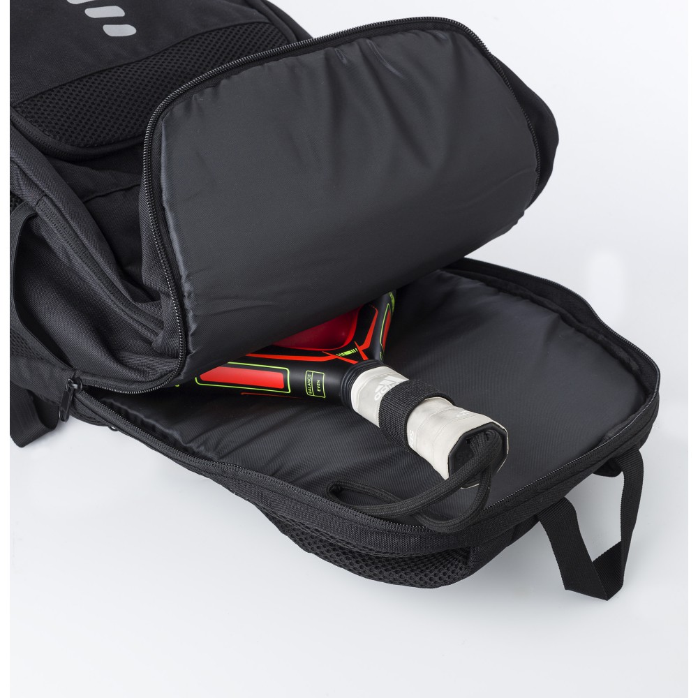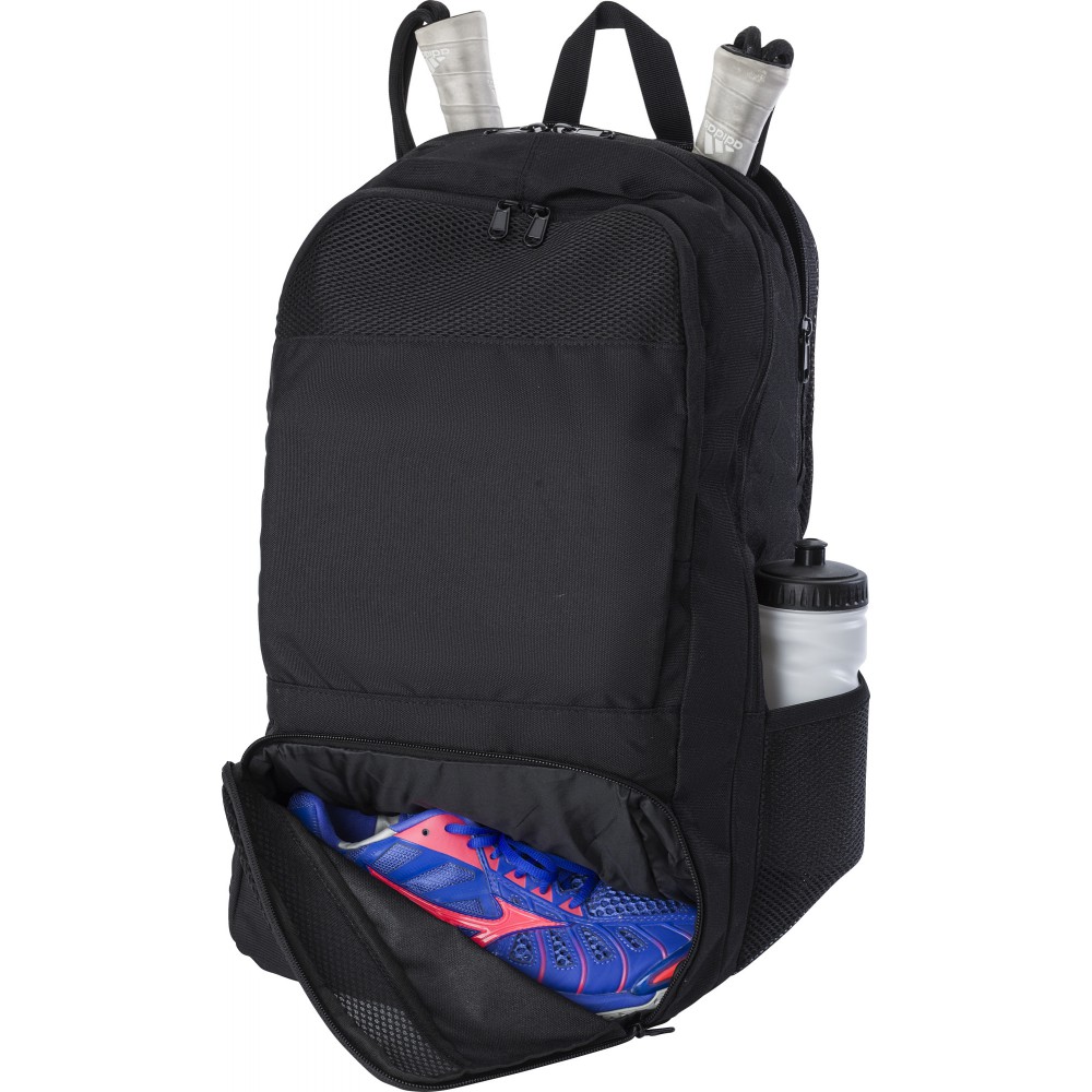 RPET poliészter többfunkciós hátizsák. 210D bélés és RPET 600D külső. Funkciók: ütőtartó zseb, lopásgátló zseb, cipőzseb, laptop zseb, palacktartók. A táska párnázott, állítható pántokkal rendelkezik, és vízlepergető bevonattal van ellátva.