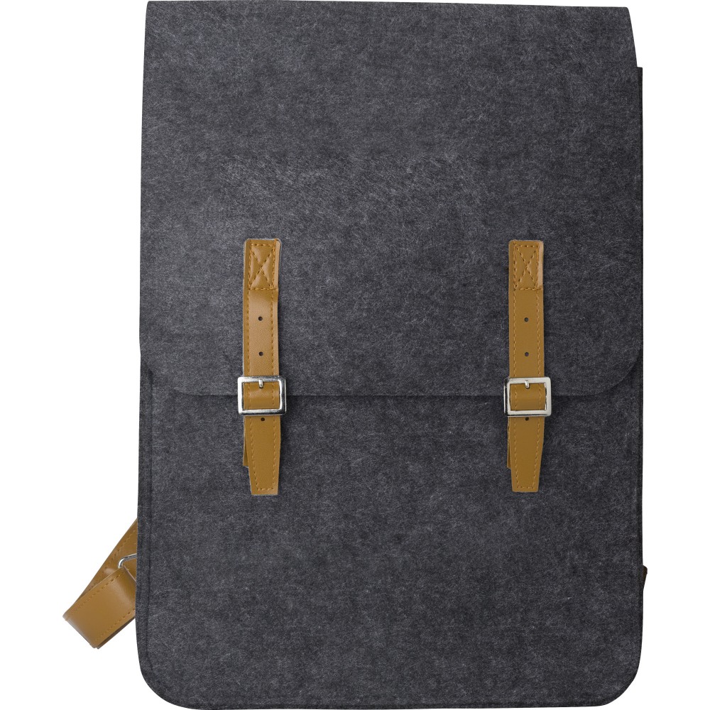 RPET filc hátizsák PU részletekkel. Egy nagy és egy kisebb zseb az elején. A táska két csattal záródik.