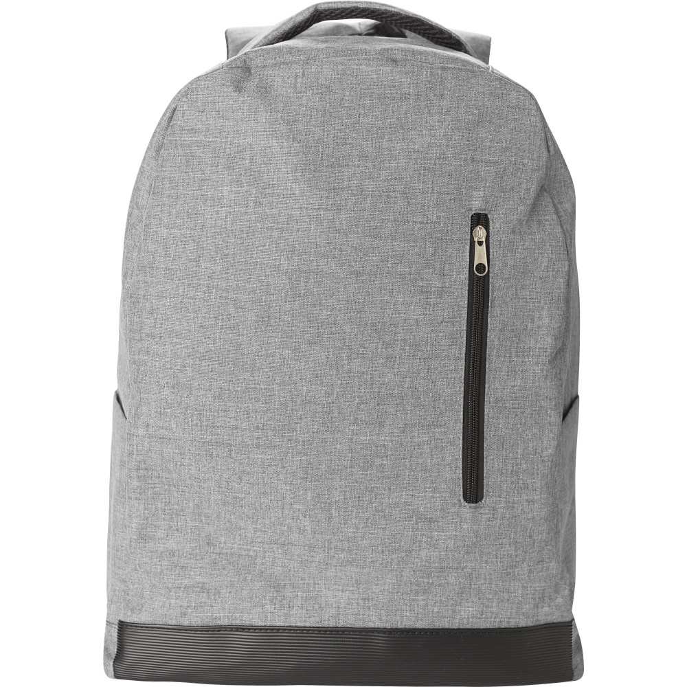 600D RPET poliészter lopásgátló hátizsák hátul gurulós bőröndre húzható pánttal. Elöl egy kis cipzáros zseb. Mindkét oldalán palacktartó zseb. Belül egy nagy rekesz tépőzáras laptop zsebbel. Alkalmas nagyméretű laptopokhoz. Állítható vállpántok. Alul egy kis bélelt rész újrahasznosított autógumiból.