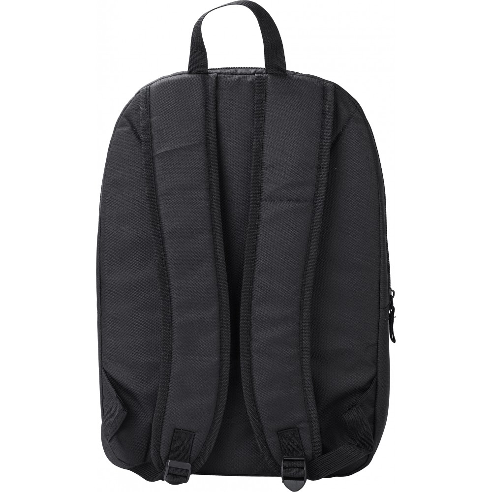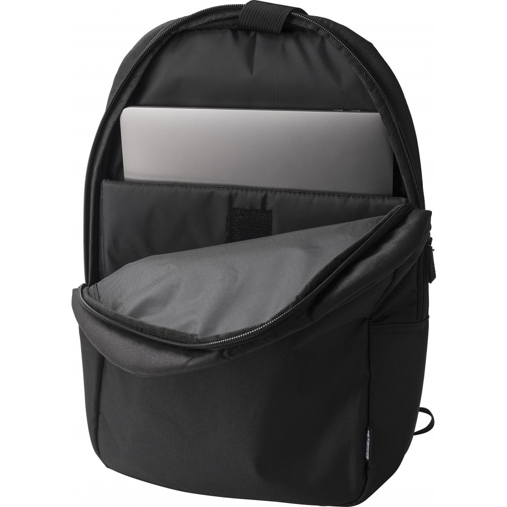Basic laptop hátizsák 15"-es laptop számára. Egy nagy rekesz laptoptartóval. Az elején egy kis cipzáras zseb. 600D RPET poliészter.